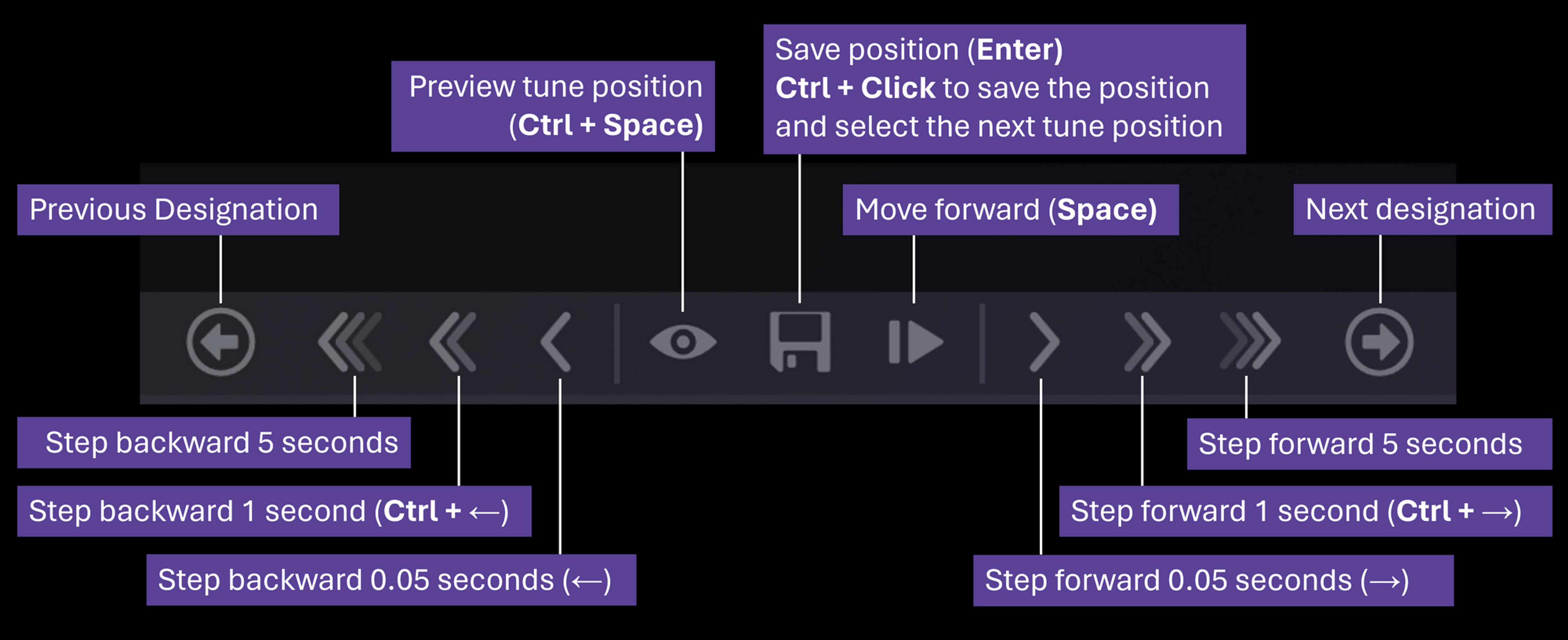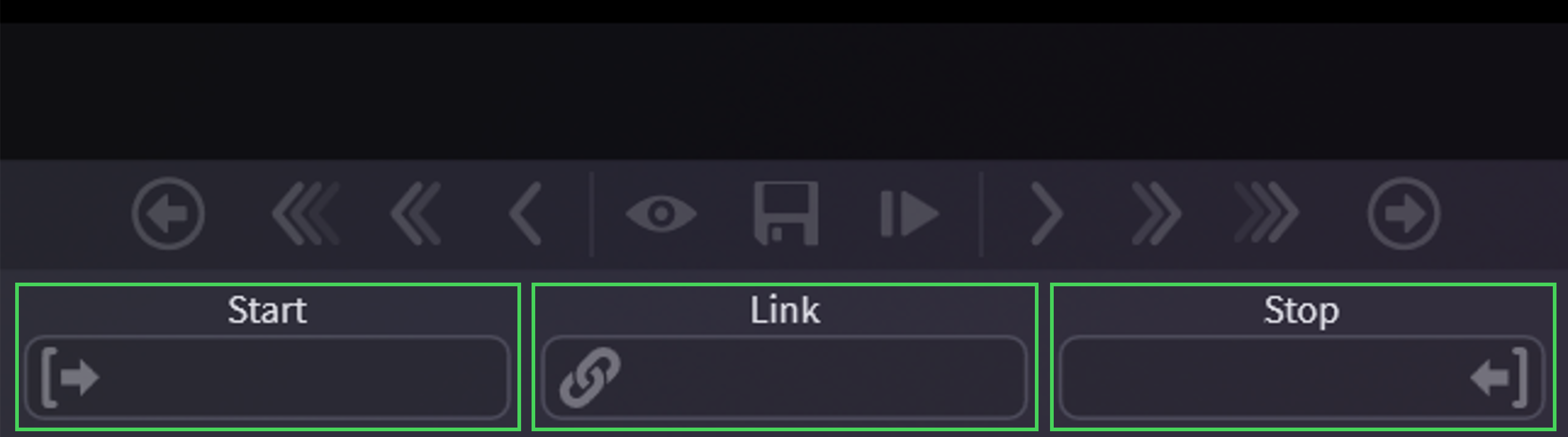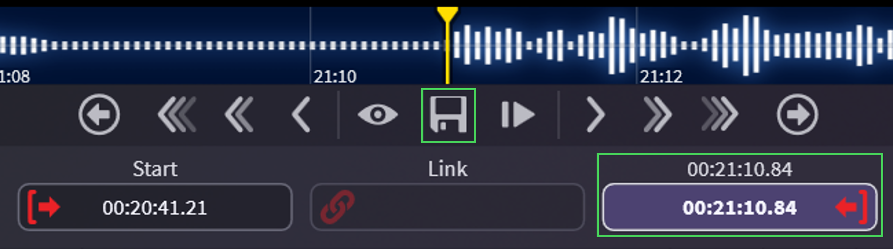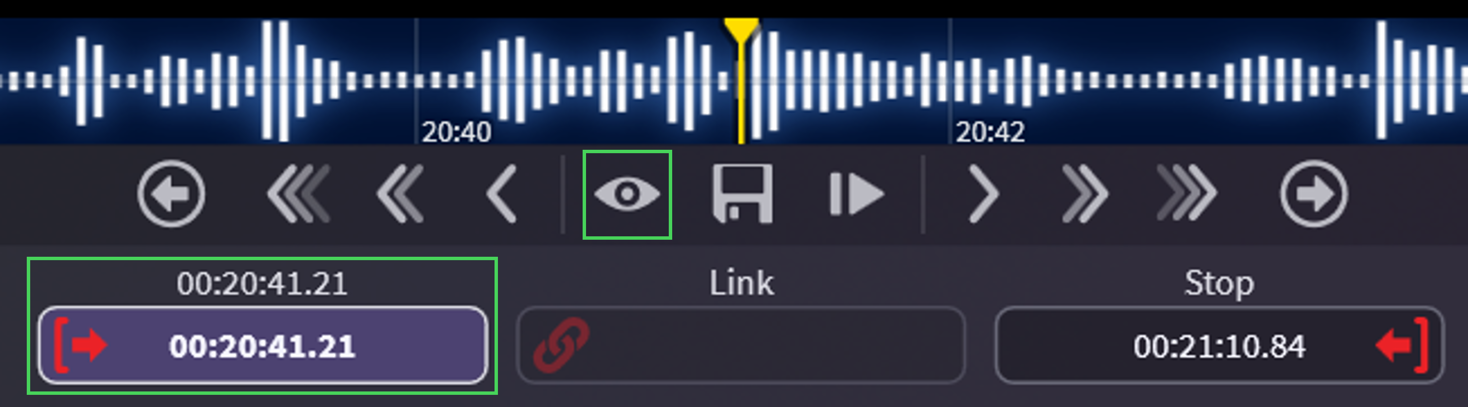 Before we start to tune our clip, notice that the editing tool in the Designation Editor Pane is greyed out when no designation clip is selected. It shows the Start, Link, and Stop positions, respectively. Once a clip has been selected, it will automatically select the Start position and replace the word ‘Start’ with the timecode of where the yellow playhead is positioned on the waveform (selecting Link or Stop has the same behavior).