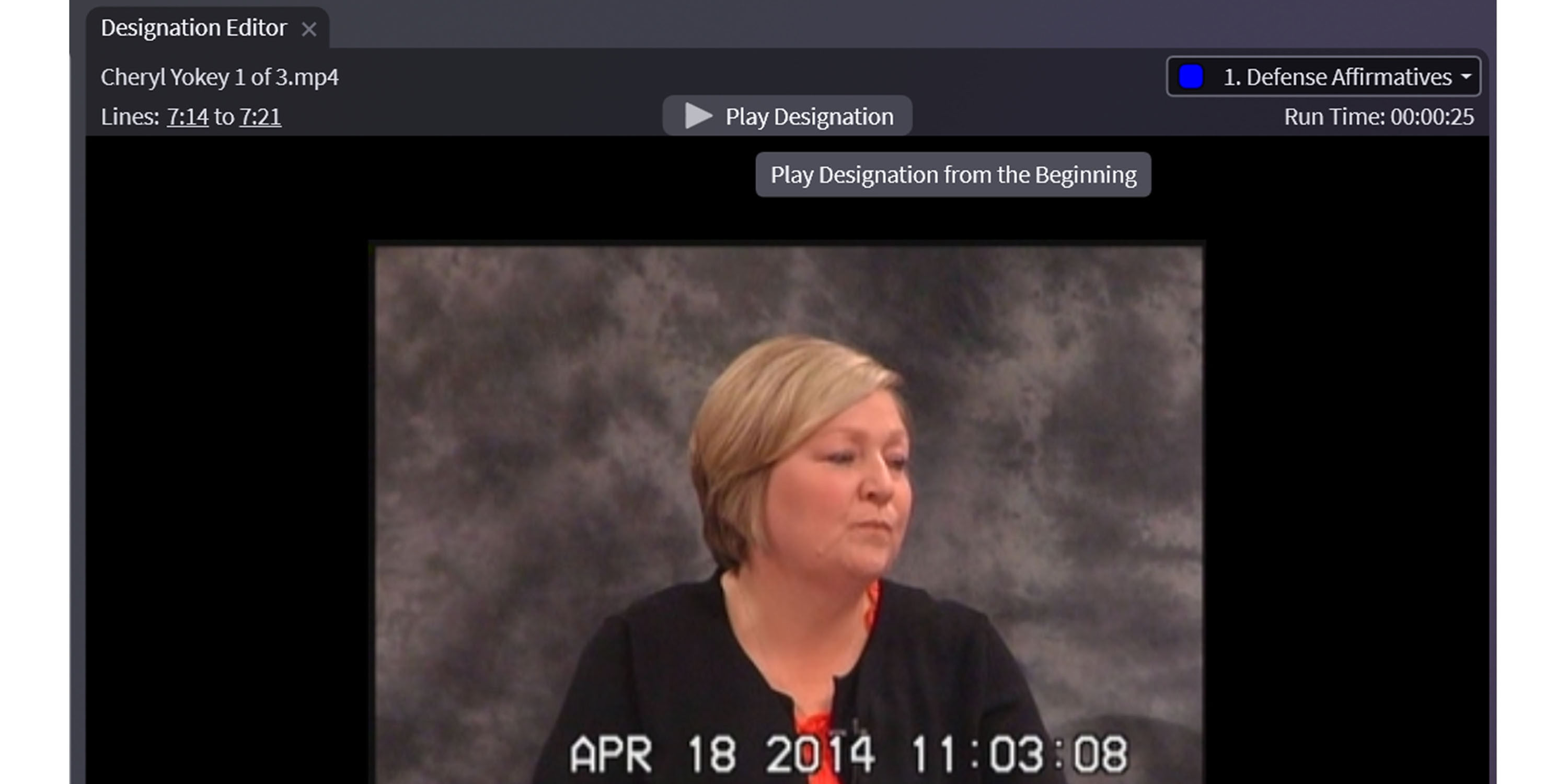 Designation Lists are the page/line clips of the deposition testimony for the purpose of playback in court. You will need a synchronized transcript file (.mdb or an OnCue xml) and the raw deposition video to use this feature (see Adding Synchronized Transcripts). Once your lists are created you want to tune the start and stop points of every clip to get it ready for playback.