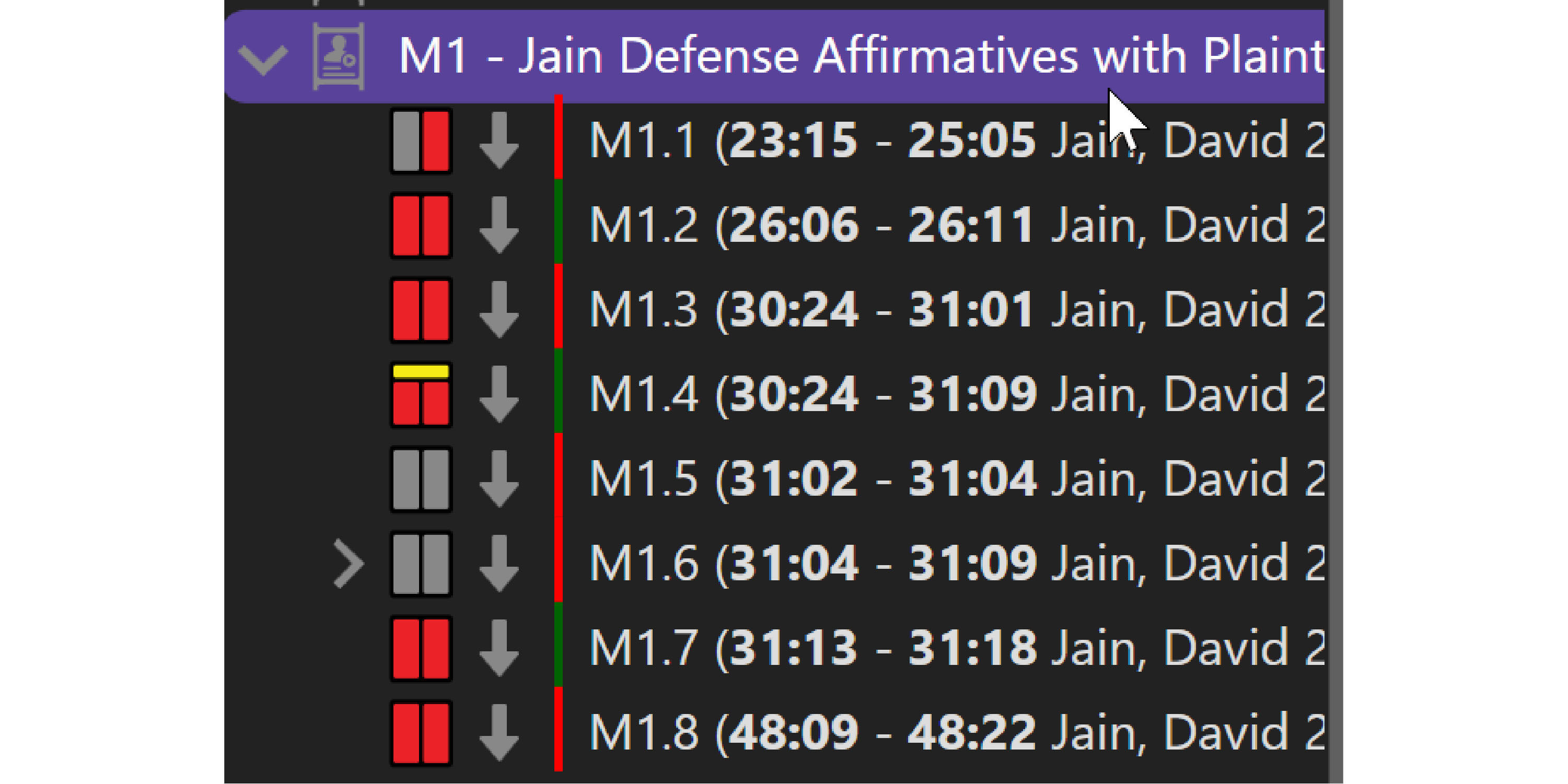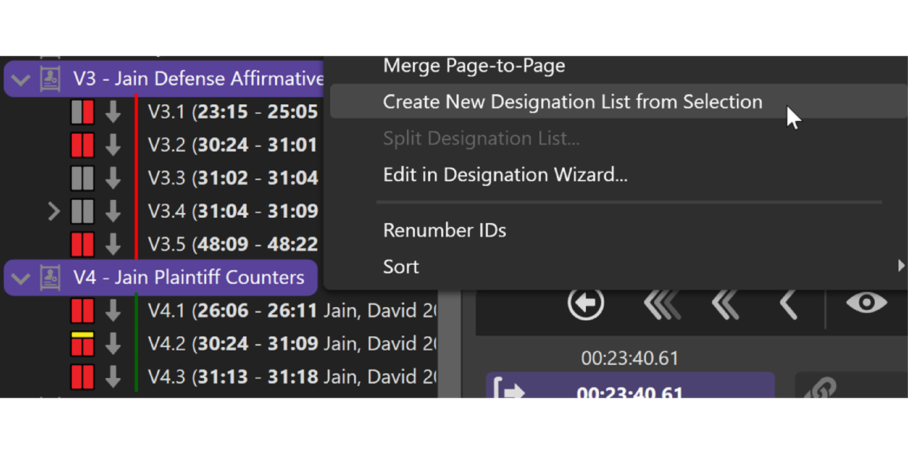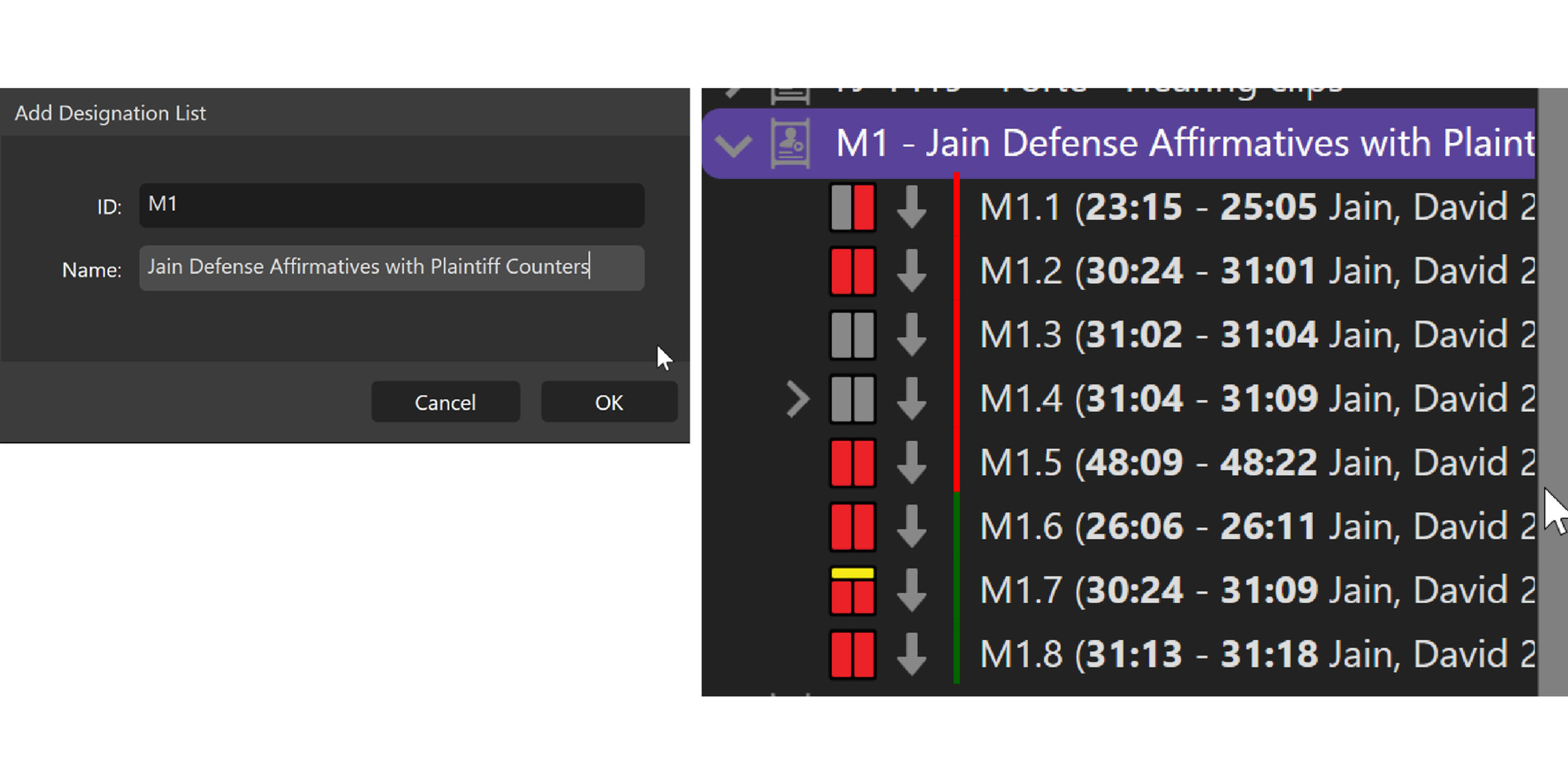 Designation Lists are the page/line clips of the deposition testimony for the purpose of playback in court. You will need a synchronized transcript file (.mdb or an OnCue xml) and the raw deposition video to use this feature (see Adding Synchronized Transcripts). There are several ways to create Designation Lists in OnCue (manually, importing lists and through the Designation Wizard. Below is an explanation of the first, quick way to create a list and add single designations.