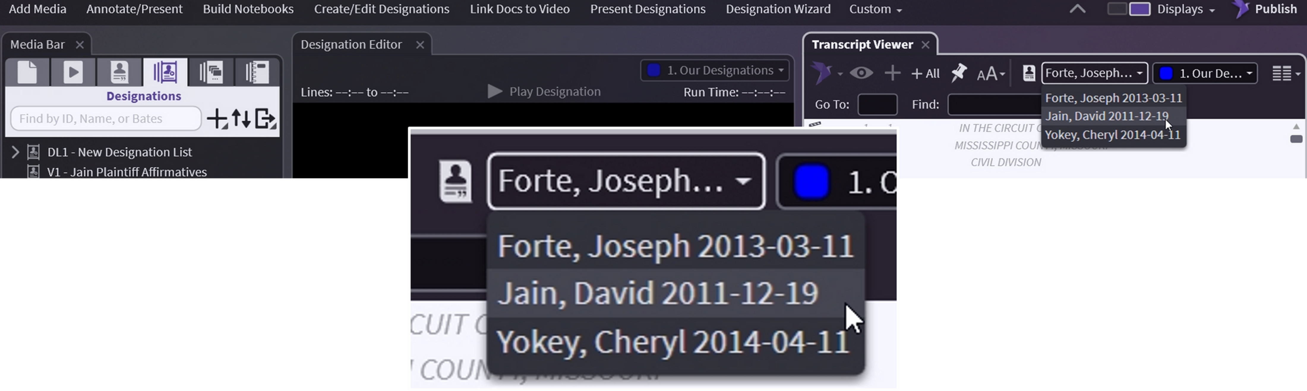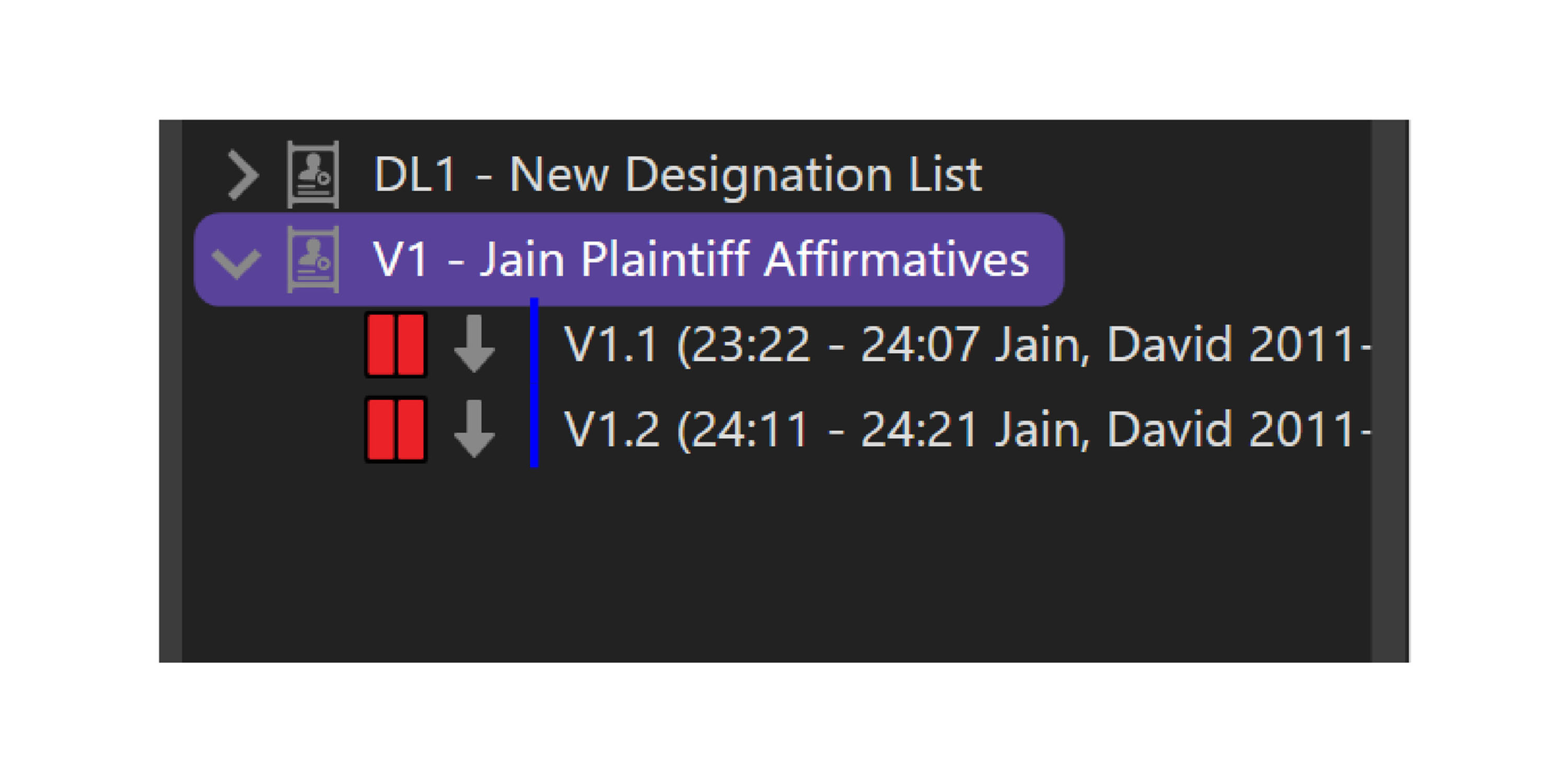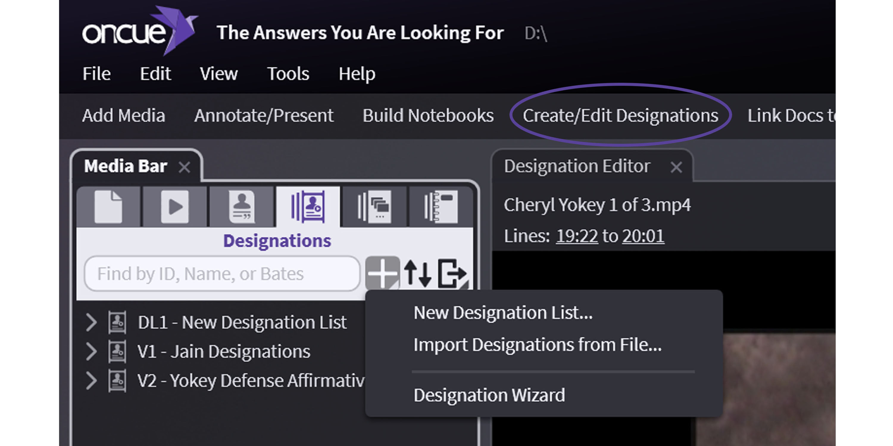Designation Lists are the page/line clips of the deposition testimony for the purpose of playback in court. You will need a synchronized transcript file (.mdb or an OnCue xml) and the raw deposition video to use this feature (see Adding Synchronized Transcripts). There are several ways to create Designation Lists in OnCue (manually, importing lists and through the Designation Wizard. Below is an explanation of the first, quick way to create a list and add single designations.