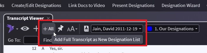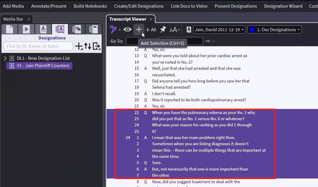 Once you have created the Designation List, you can add the page/line designations. There is no limit to the number of designations you can have in a List, and you can designate from different Transcripts within the same Designation List if desired.