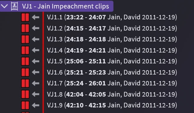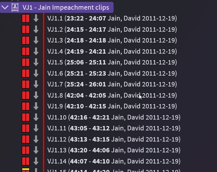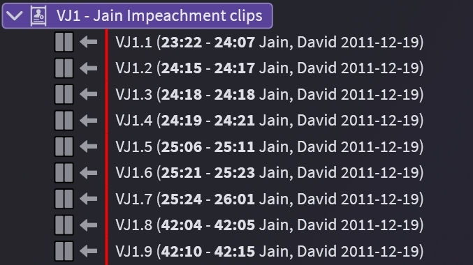 Have impeachment clips with more than one designation? No problem. You can double-click on the Auto Advance Arrow to change whether it advances or stops. In the image below, publishing VJ1.13 will also play VJ1.14. Playback will stop after VJ1.14 plays.