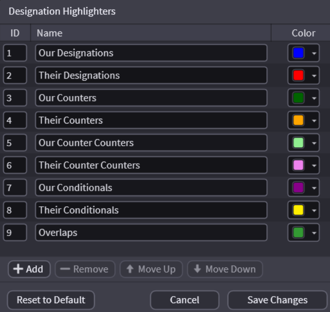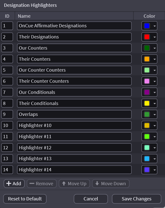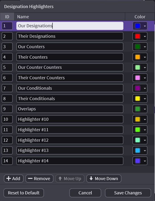 A new Window will pop up where you can choose the colors and name the descriptions. Note the number in the left column. This is the highlighter number and will be used in creating Designation List imports and determines the "Sort by Highlighter" sequence. Changing the color here changes the color globally.