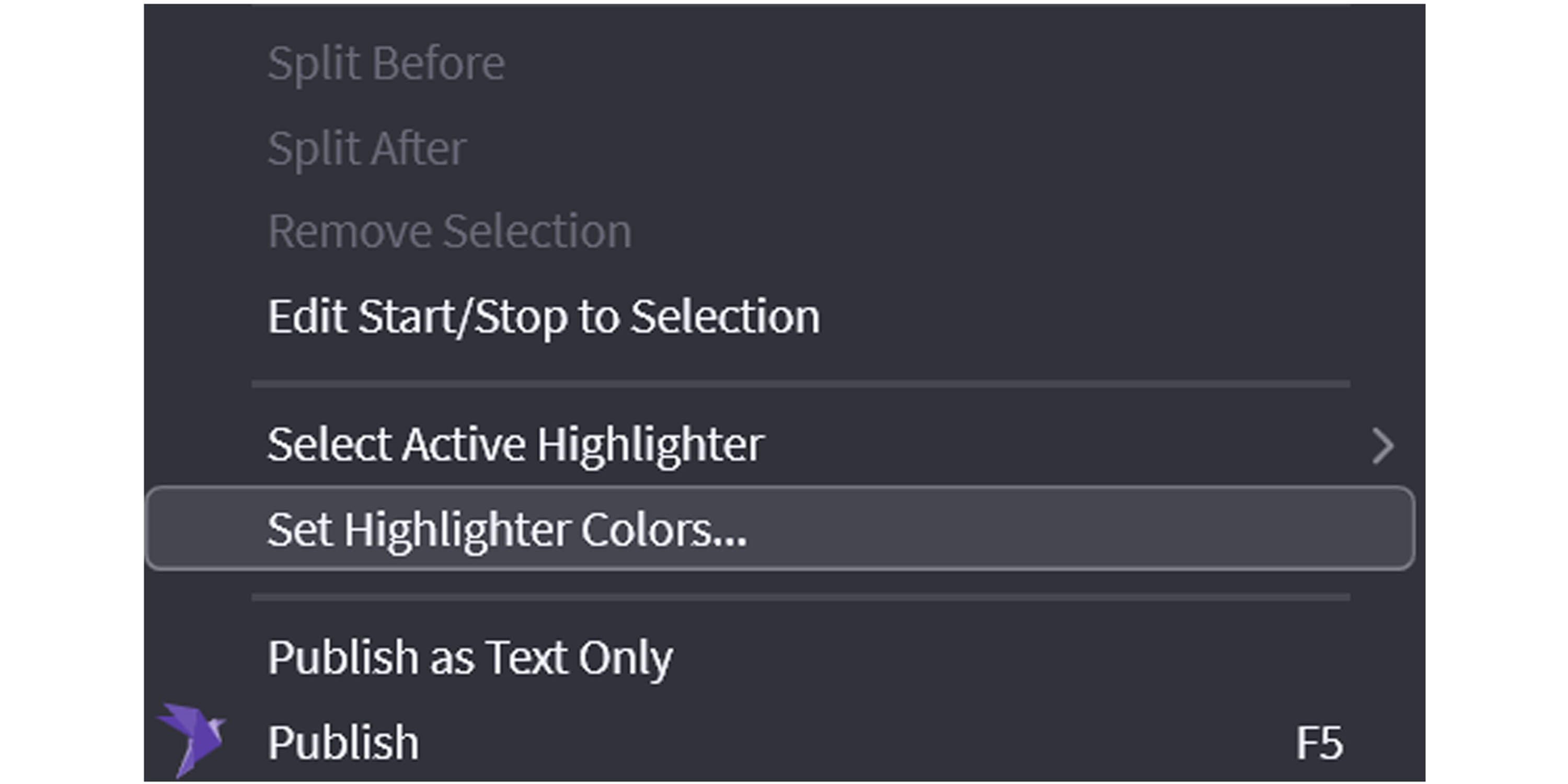 The highlighter colors can be edited by right-clicking the Transcript Viewer pane and selecting the "Set Highlighter Colors" option.