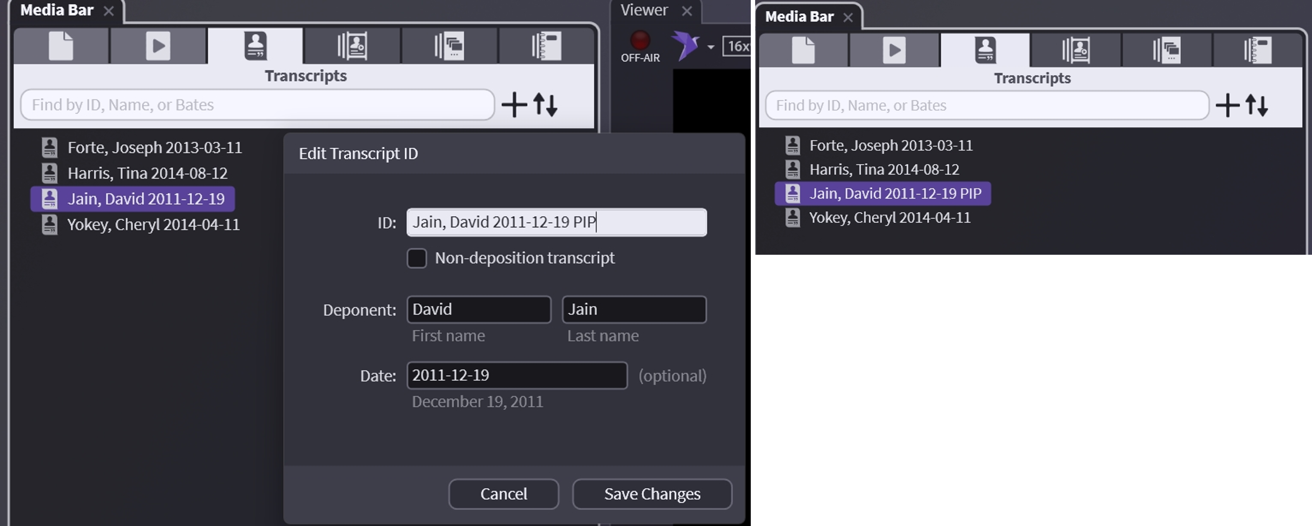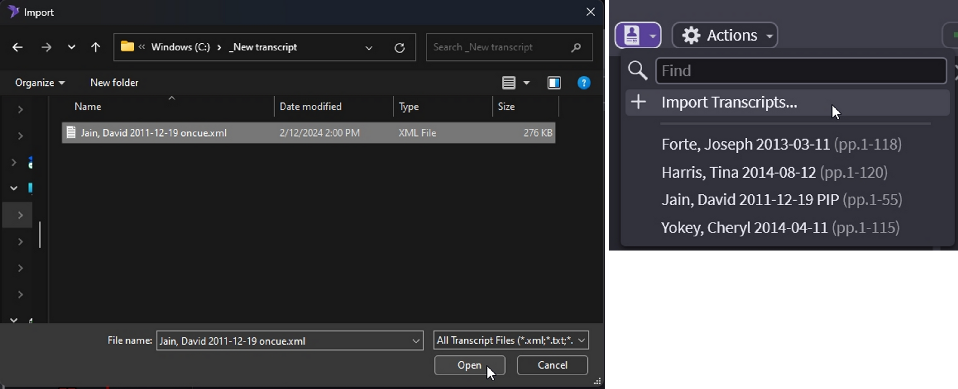 Rename your old transcript in the transcripts tab. In this example, I have a transcript (sync file) that is Picture-in-Picture. I selected my transcript and hit F2 to rename.