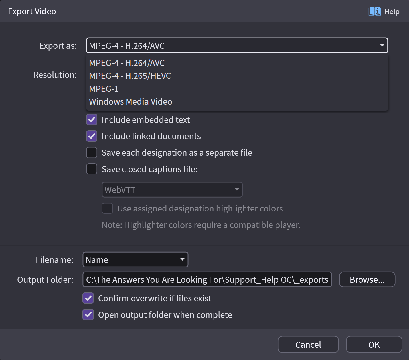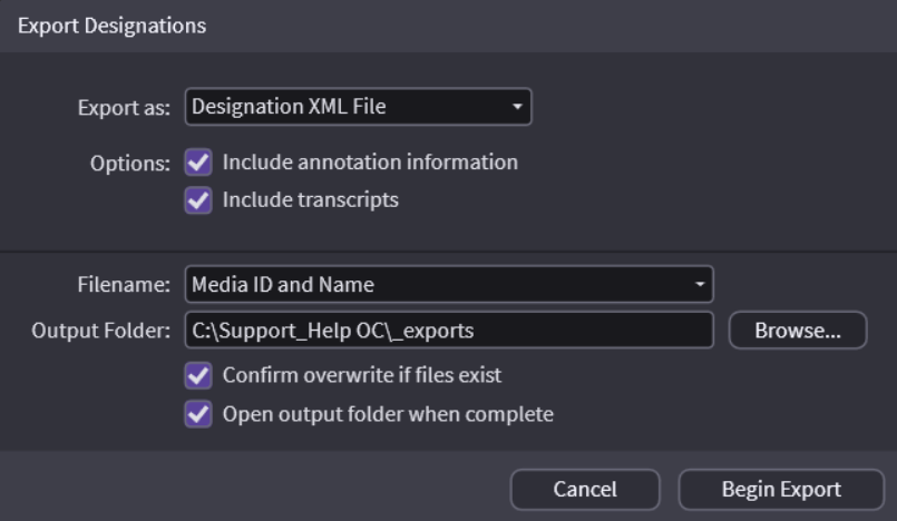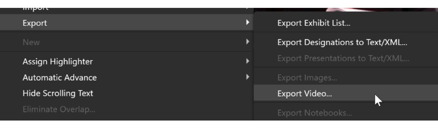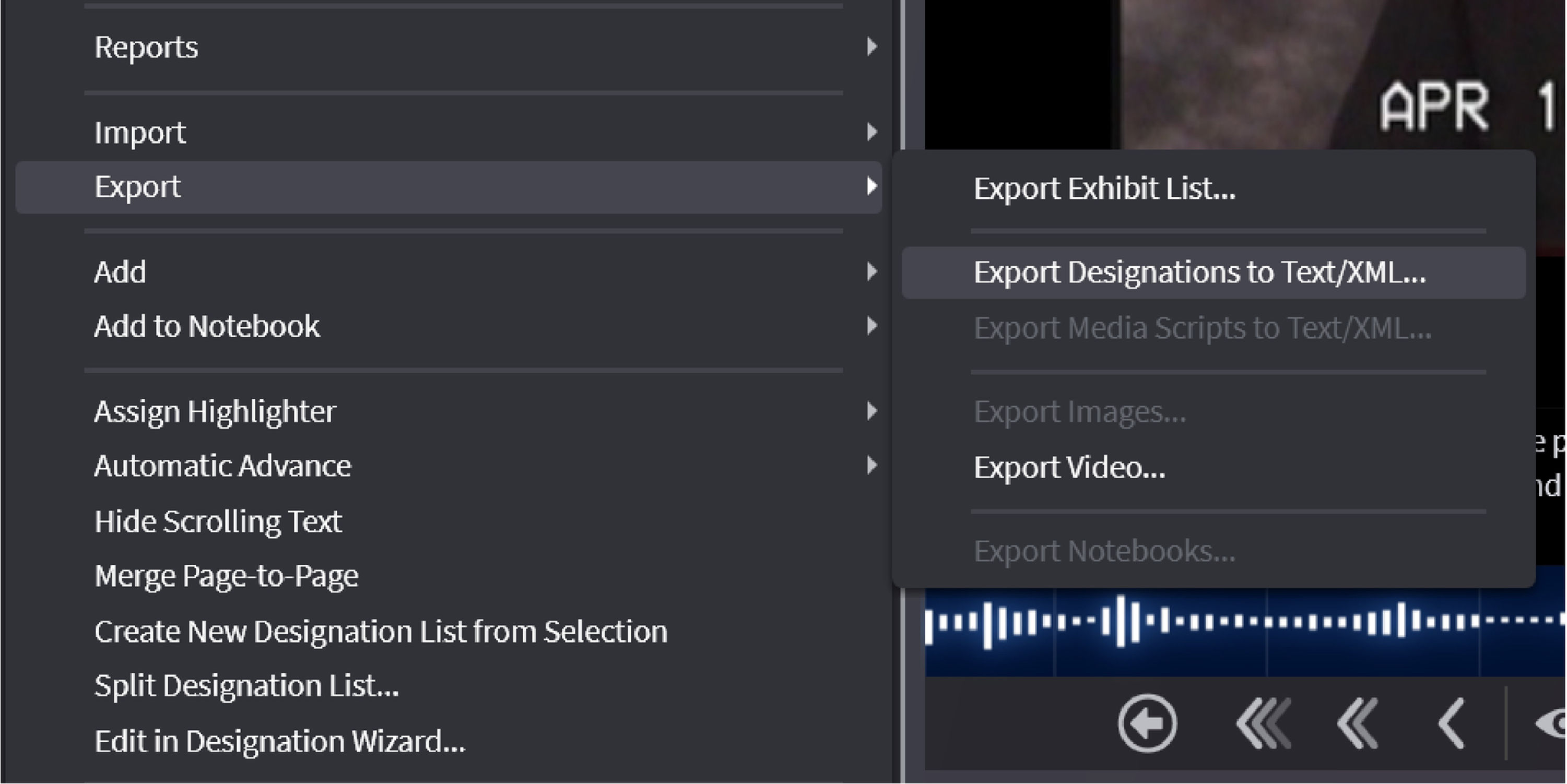 You can export your designation lists to a video file by right-clicking a selected designation list and hovering over Export. The options are shown below. NOTE: When exporting video with links - you need more than .1s before and after the link on a designation to avoid export errors.