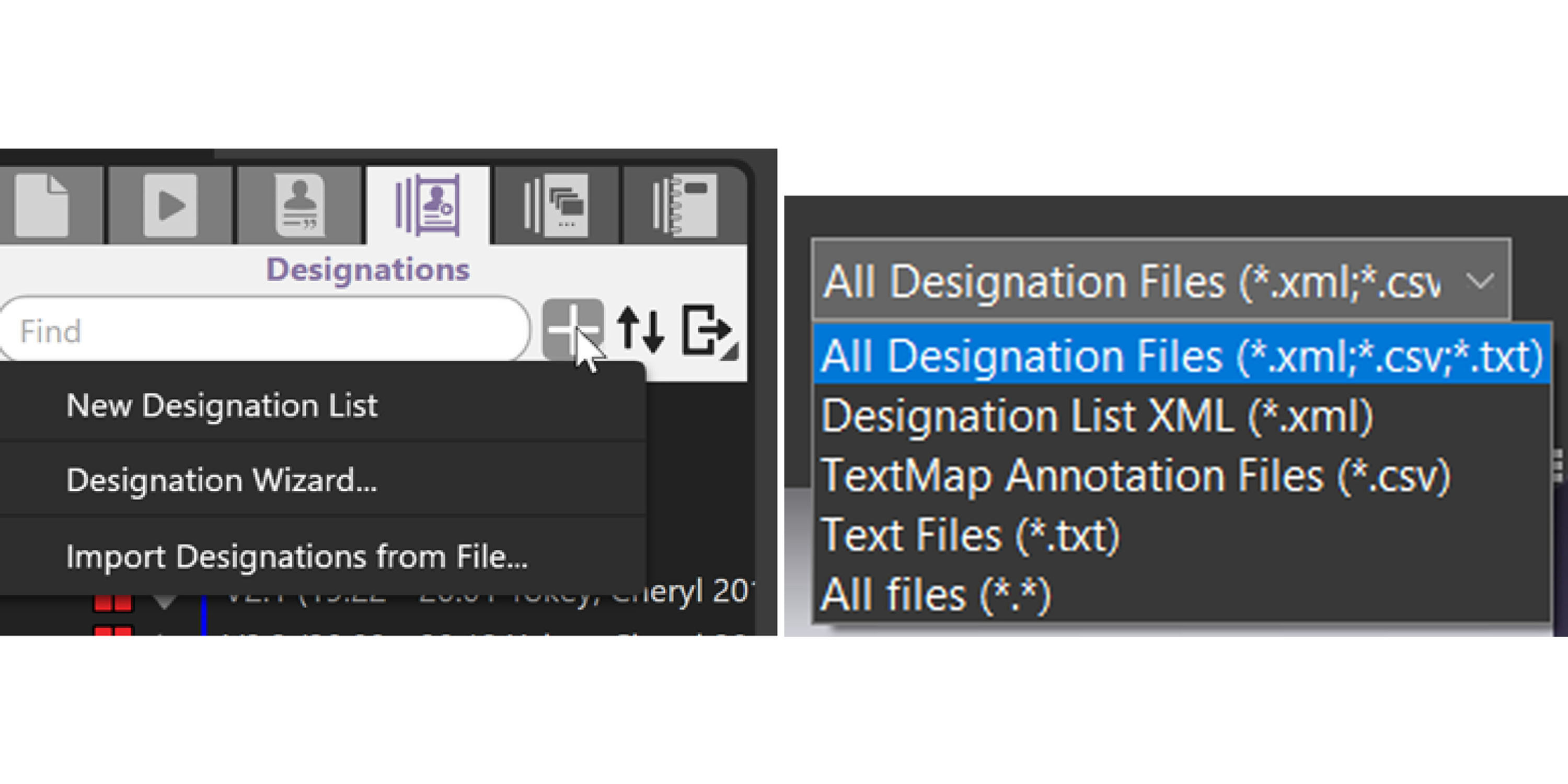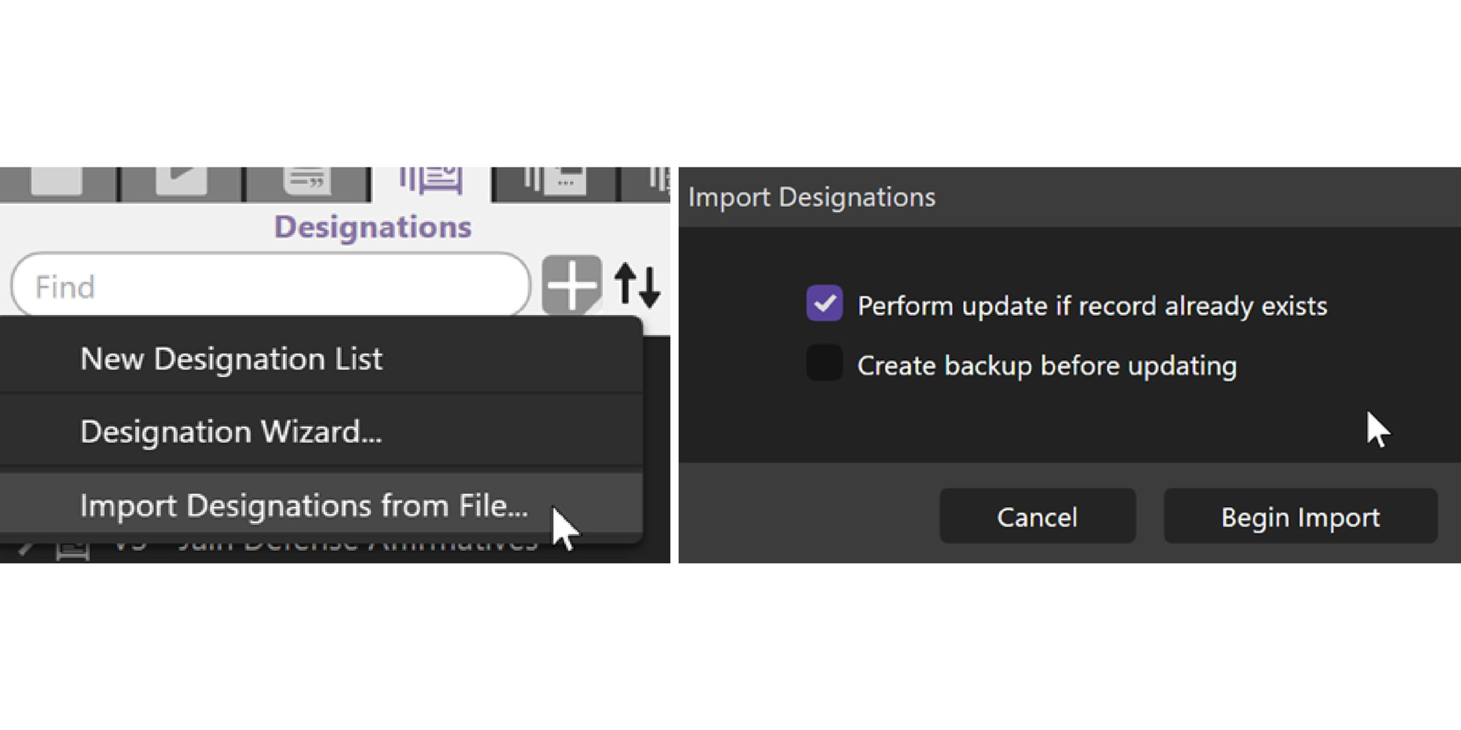 Designation Lists can be imported two ways, text file and OnCue XMLs from other cases.