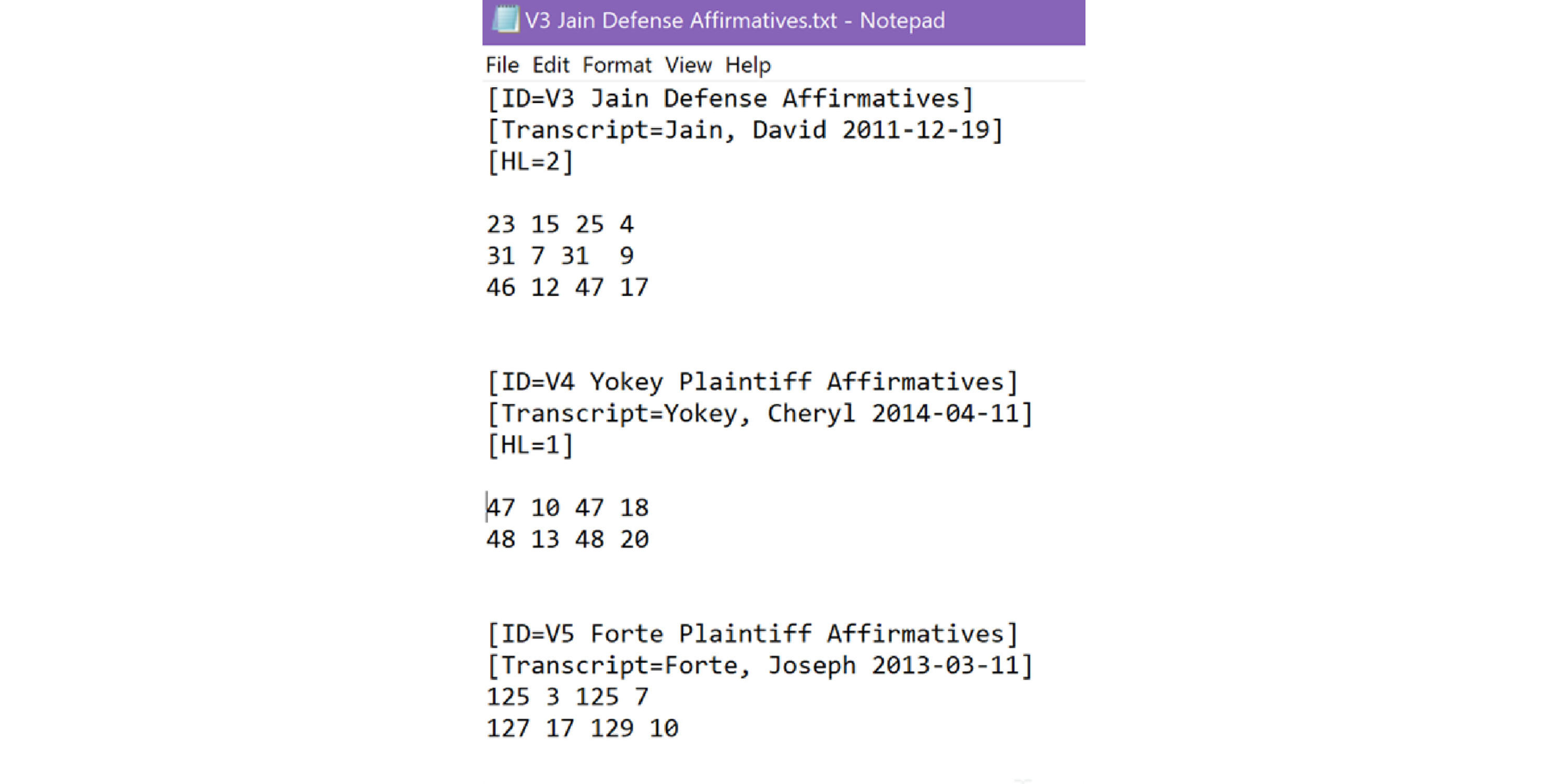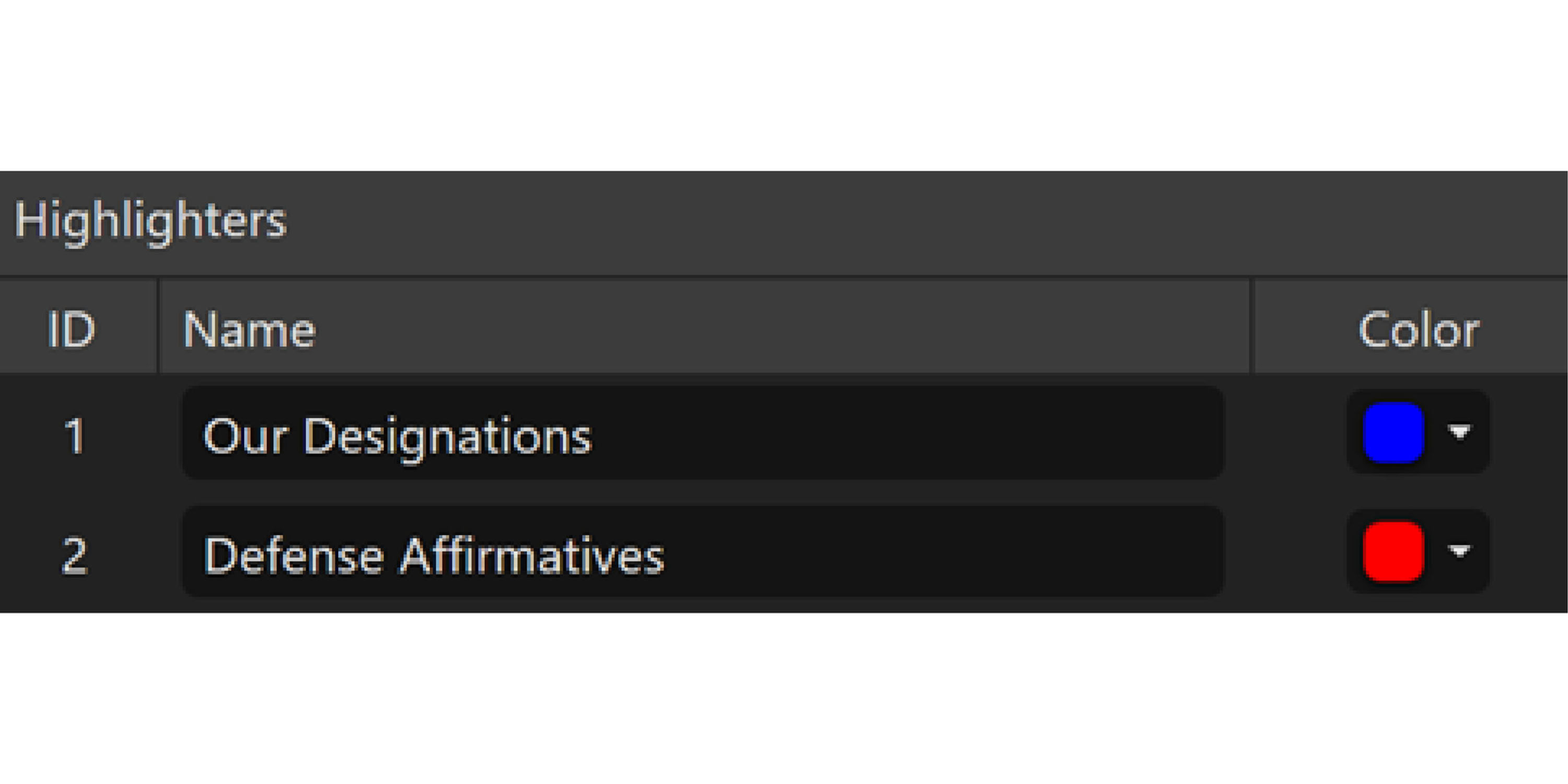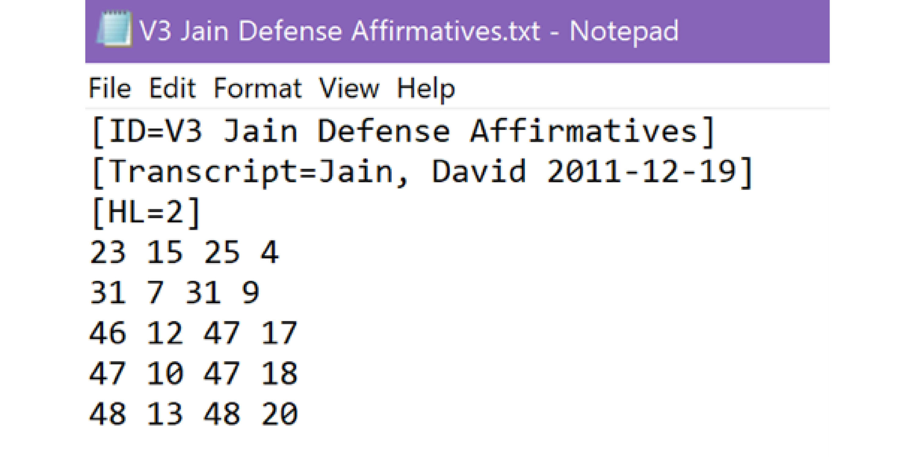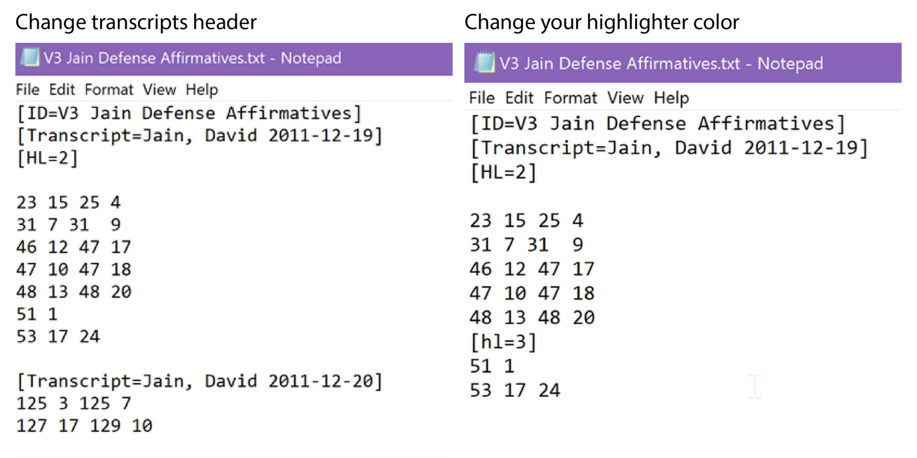 The final header identifies the highlighter color to be used for the designations directly below it. “HL=” should be followed by the number or the title of the desired color (see Explaining Transcript Highlighters for a more details). If no color is chosen, the default is 1.