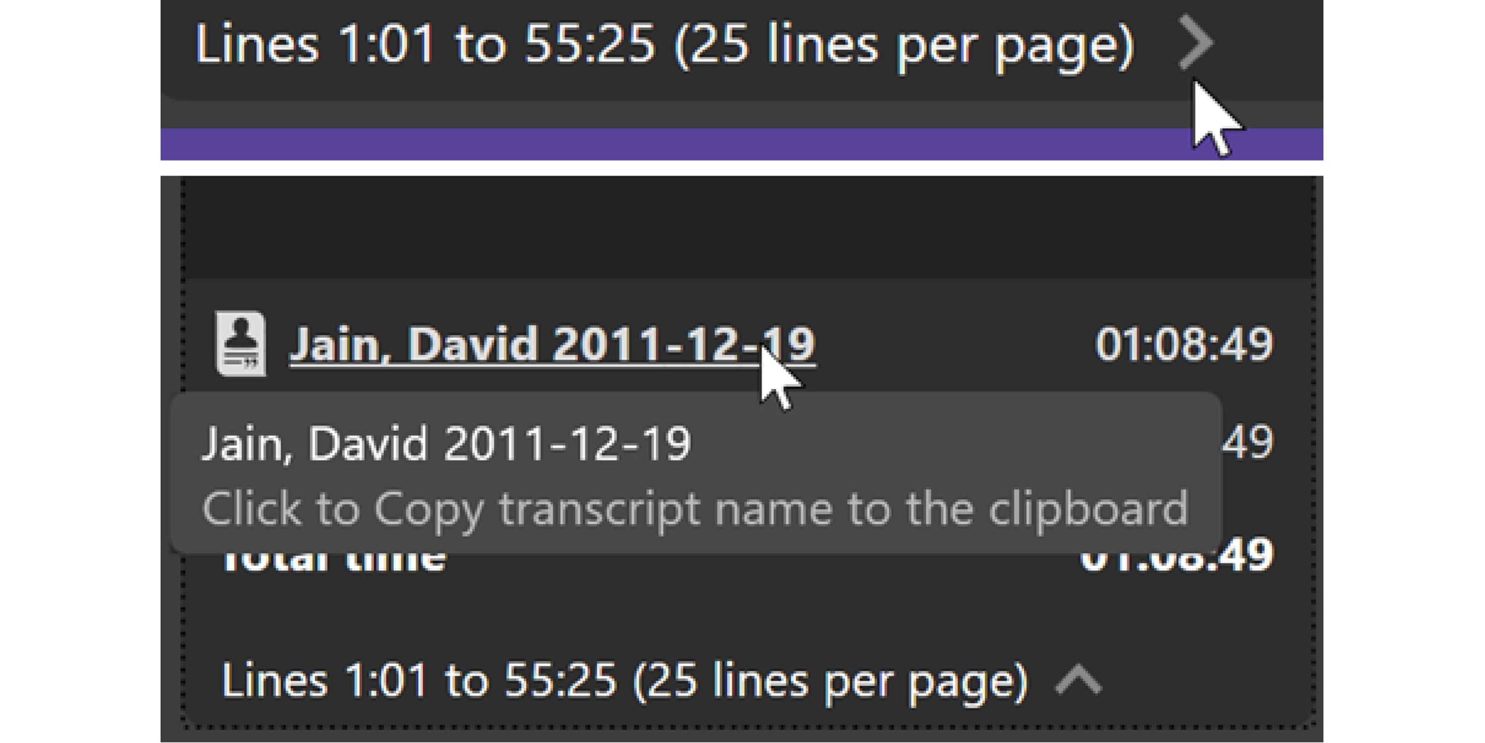 The second header line contains the Transcript ID. When you look at the Transcripts tab in OnCue that is the ID/Name - [Transcript=Jain, David 2011-12-19]