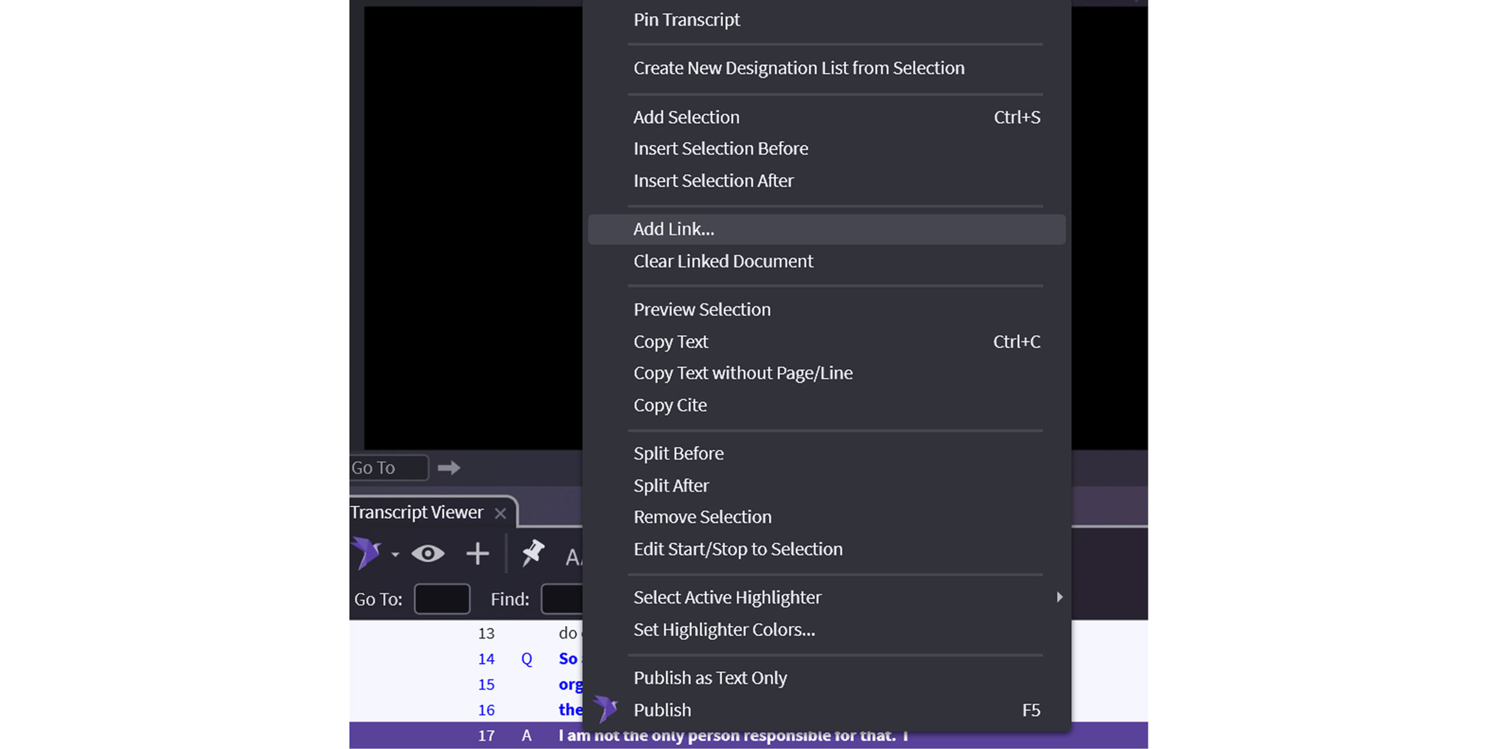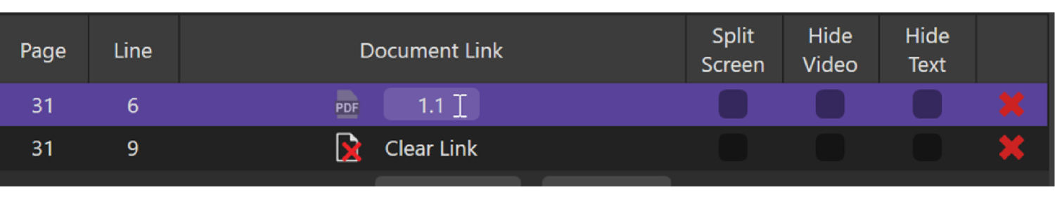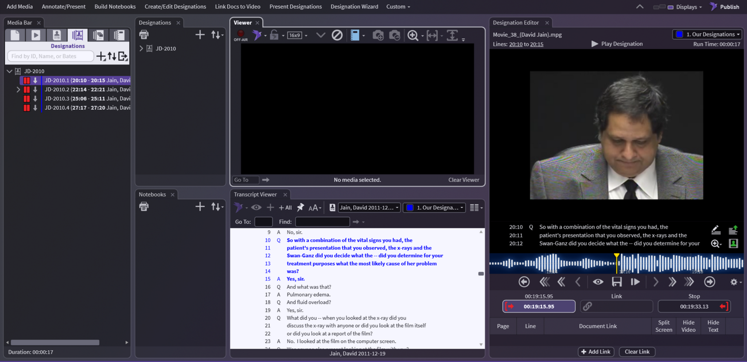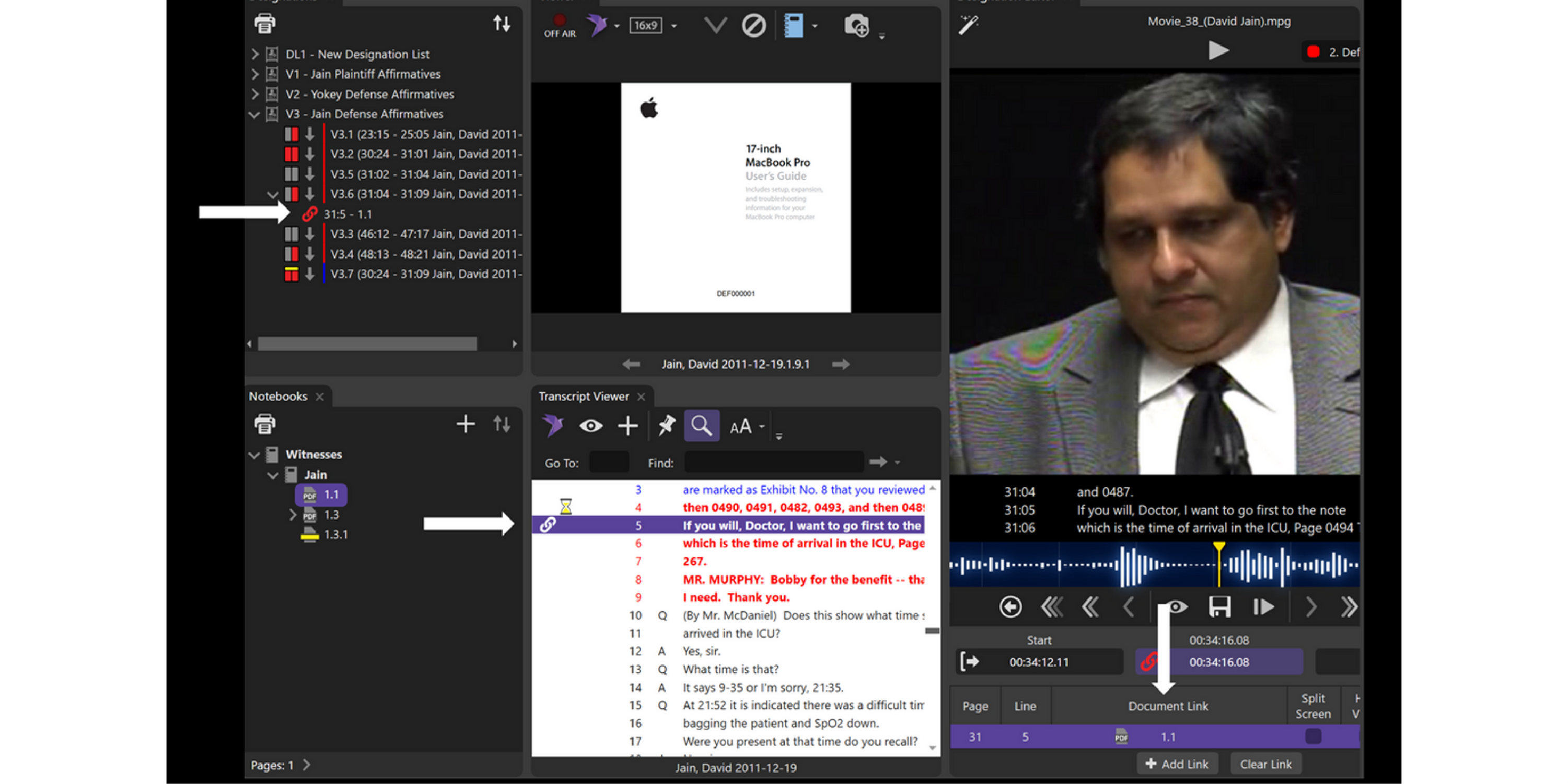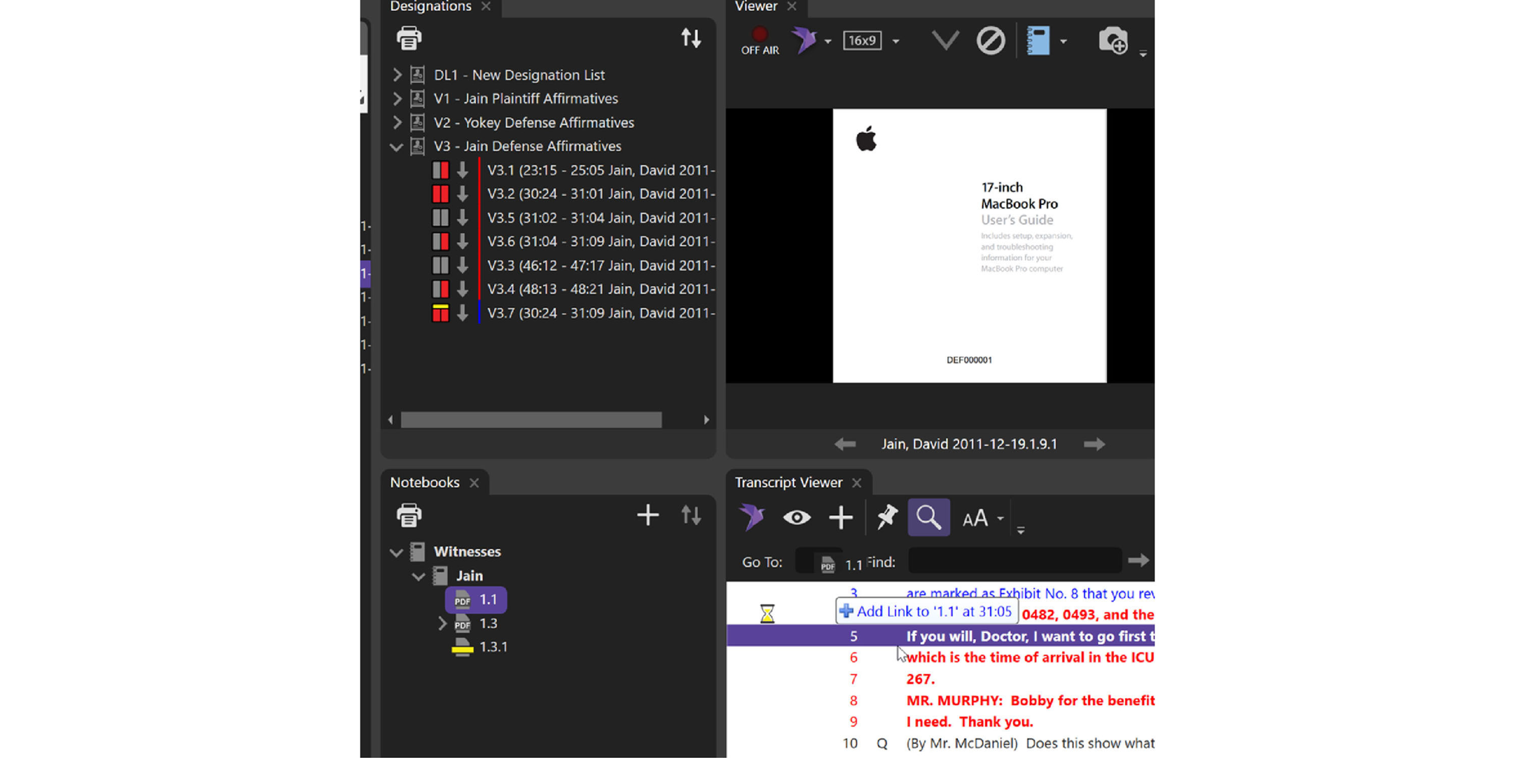 And just like the link, the Clear will now appear under the designation in the Designation List with the page/line and the ID that you linked. It will also appear in the Document Links section in the Video Editor and show in the Transcript Viewer.