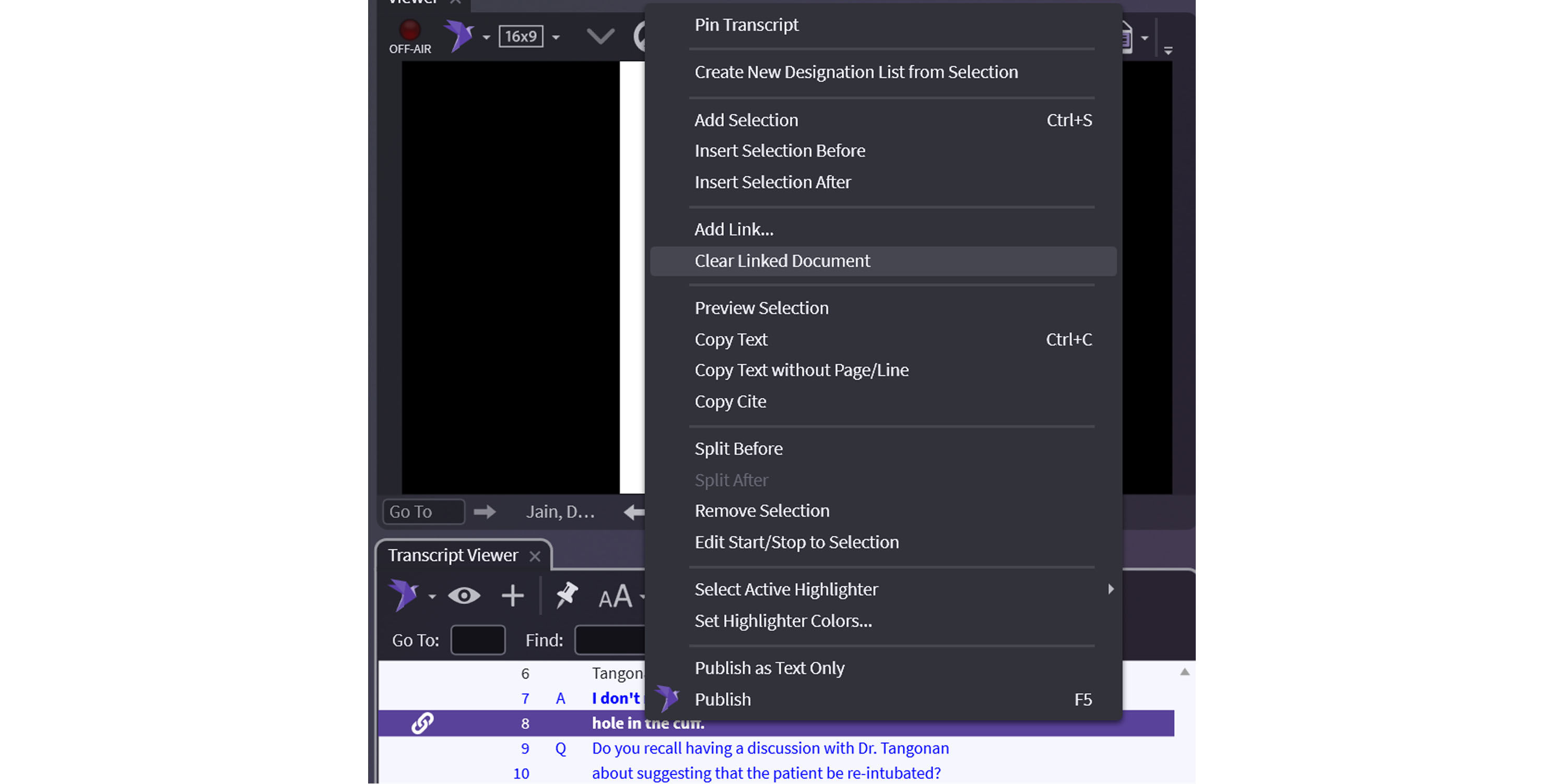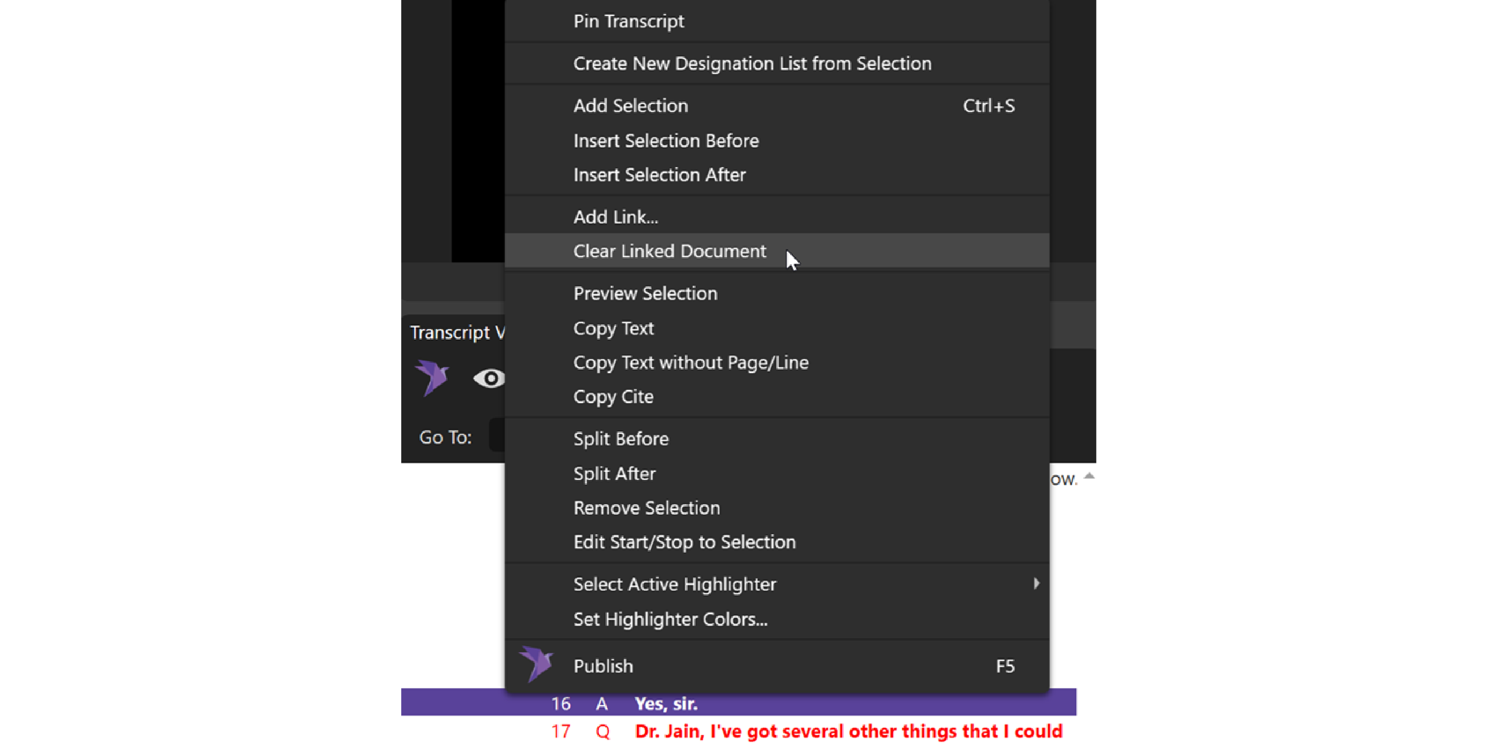 To “Hide” the document automatically, at the correct line, Right-click on the bolded testimony in the Transcript Viewer on the designation line that you want to the document to stop showing in Presentation Mode. Select Clear Linked Document. This command will make video resume playing normally, showing no documents.