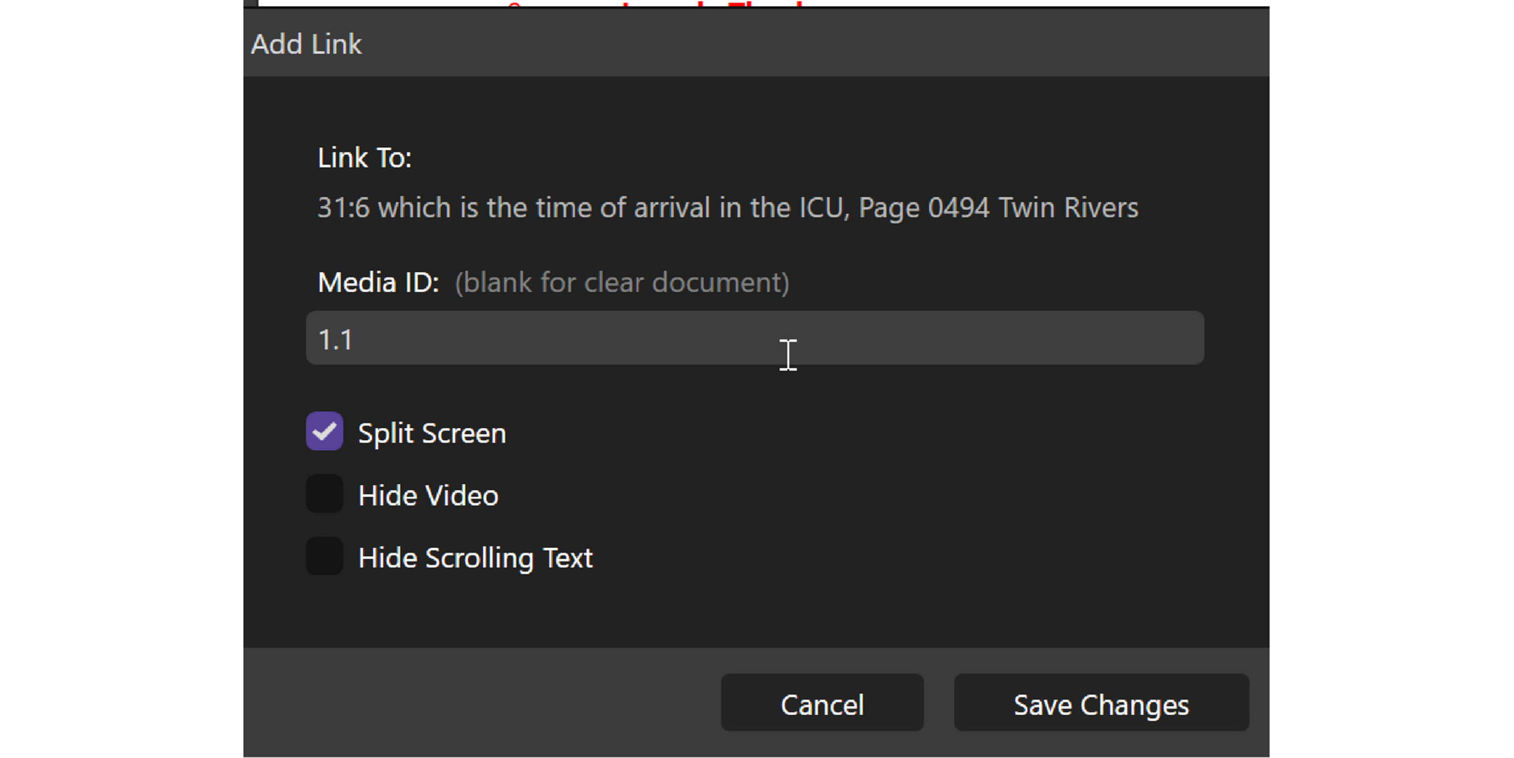 Hit Save Changes and the Link will now appear under the designation in the Designation List with the page/line and the ID that you linked. It will also appear in the Document Links section in the Video Editor and show in the Transcript Viewer.