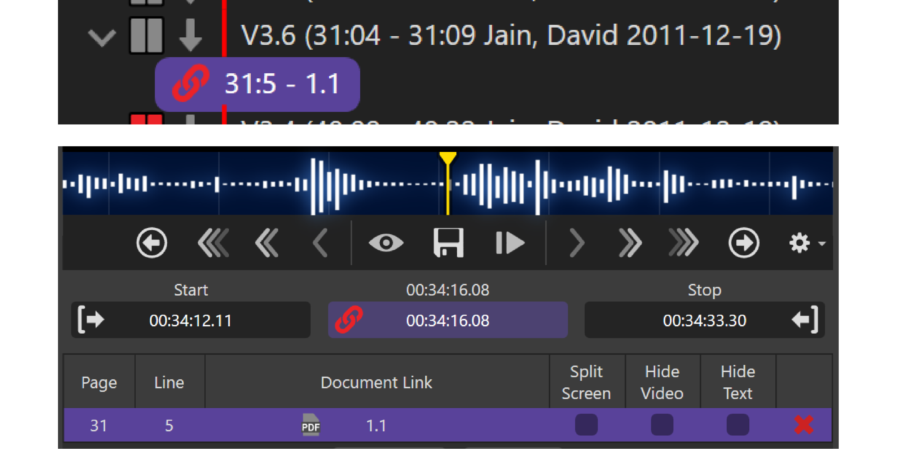The Link will now appear under the designation in the Designation List with the page/line and the ID that you linked. It will also appear in the Document Links section in the Video Editor and show in the Transcript Viewer.