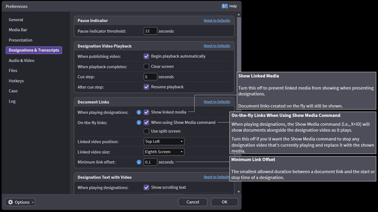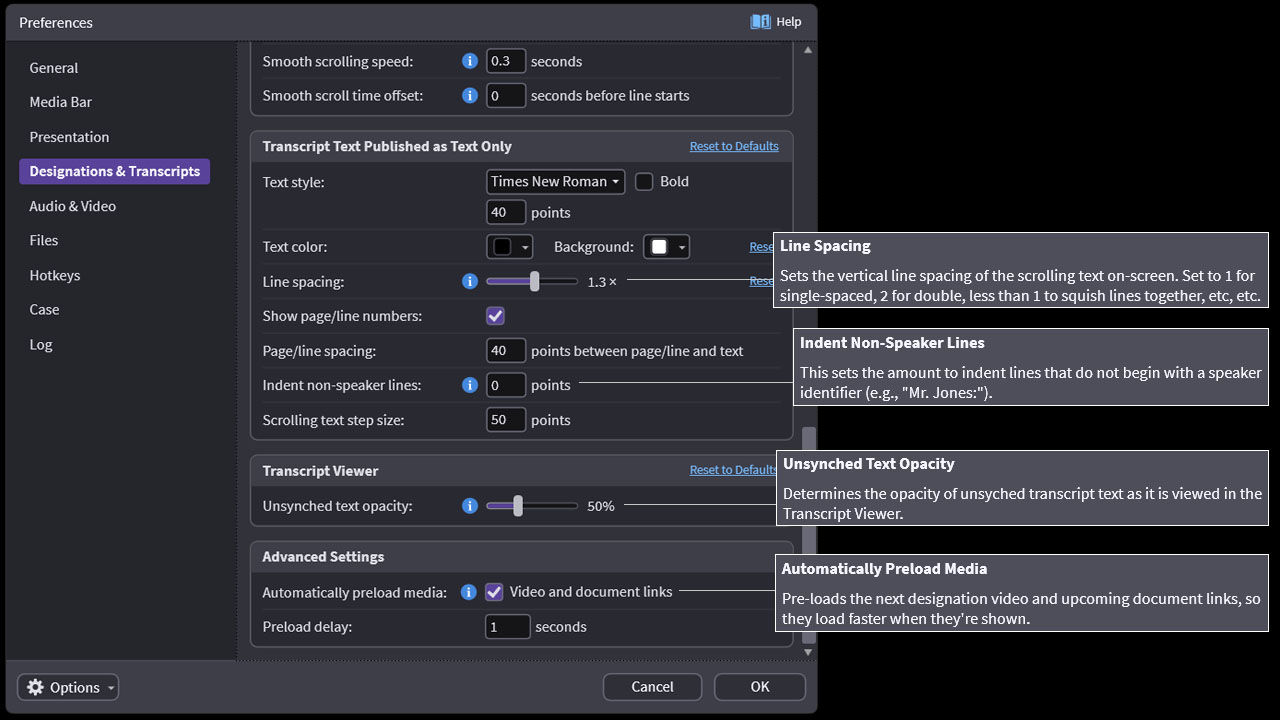 To access Preferences, go to Edit > Preferences in the top left corner of the program. Each section below shows a series of screenshots of OnCue's Preferences for your reference.