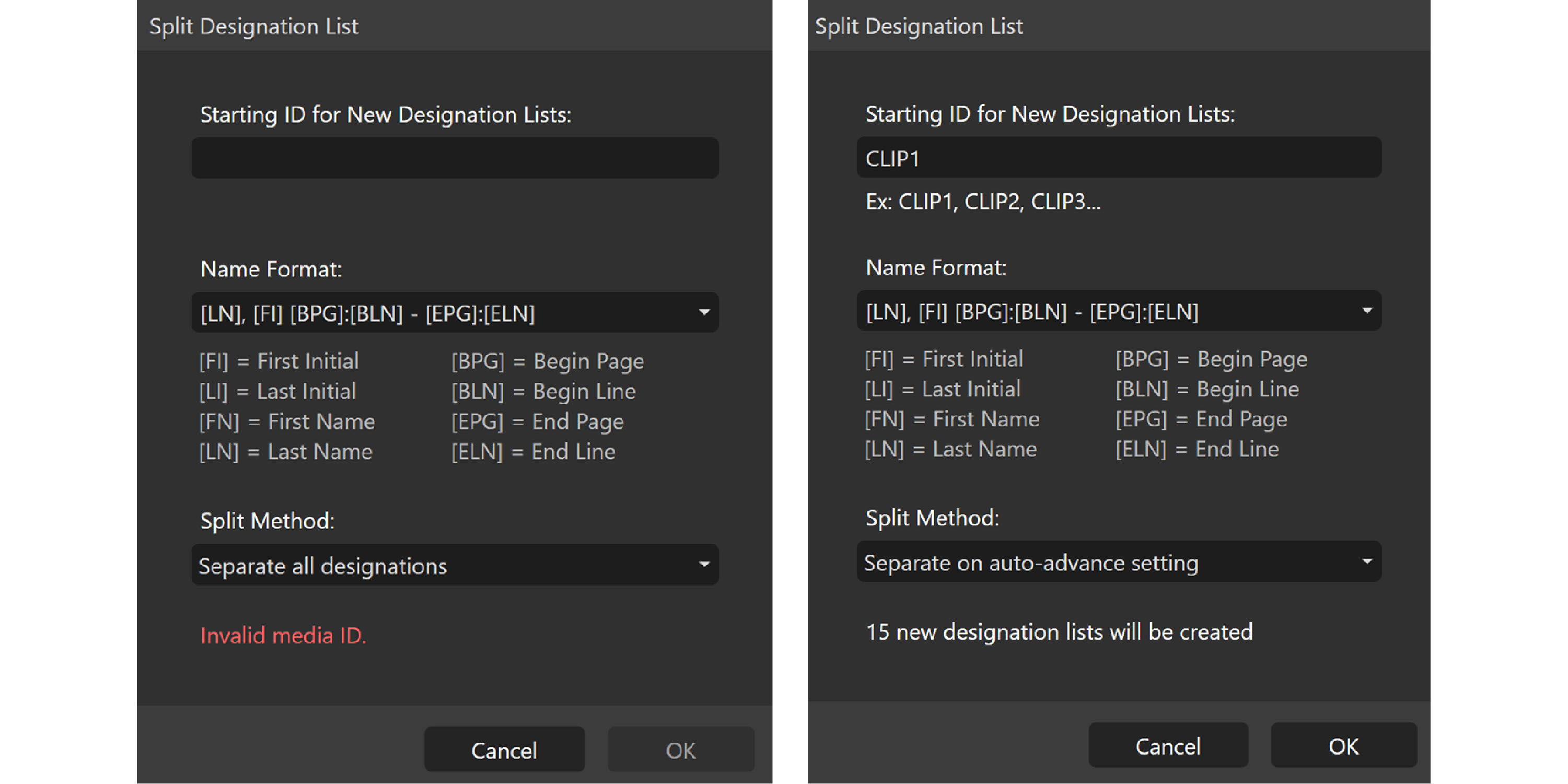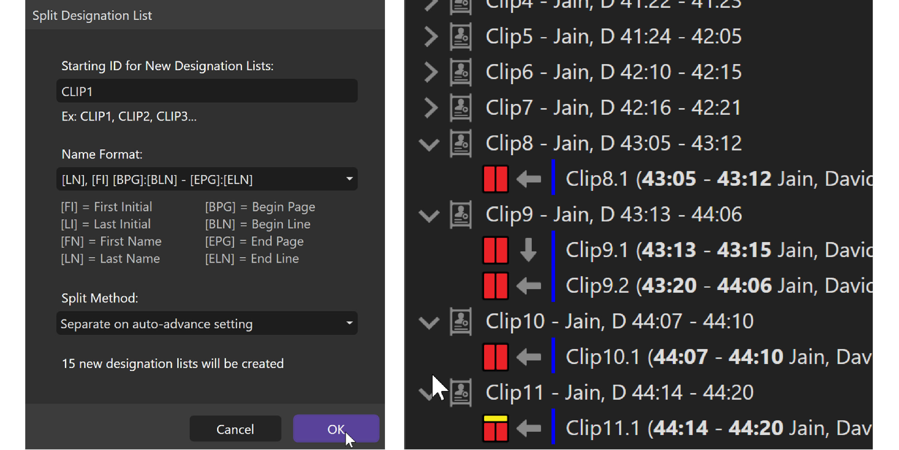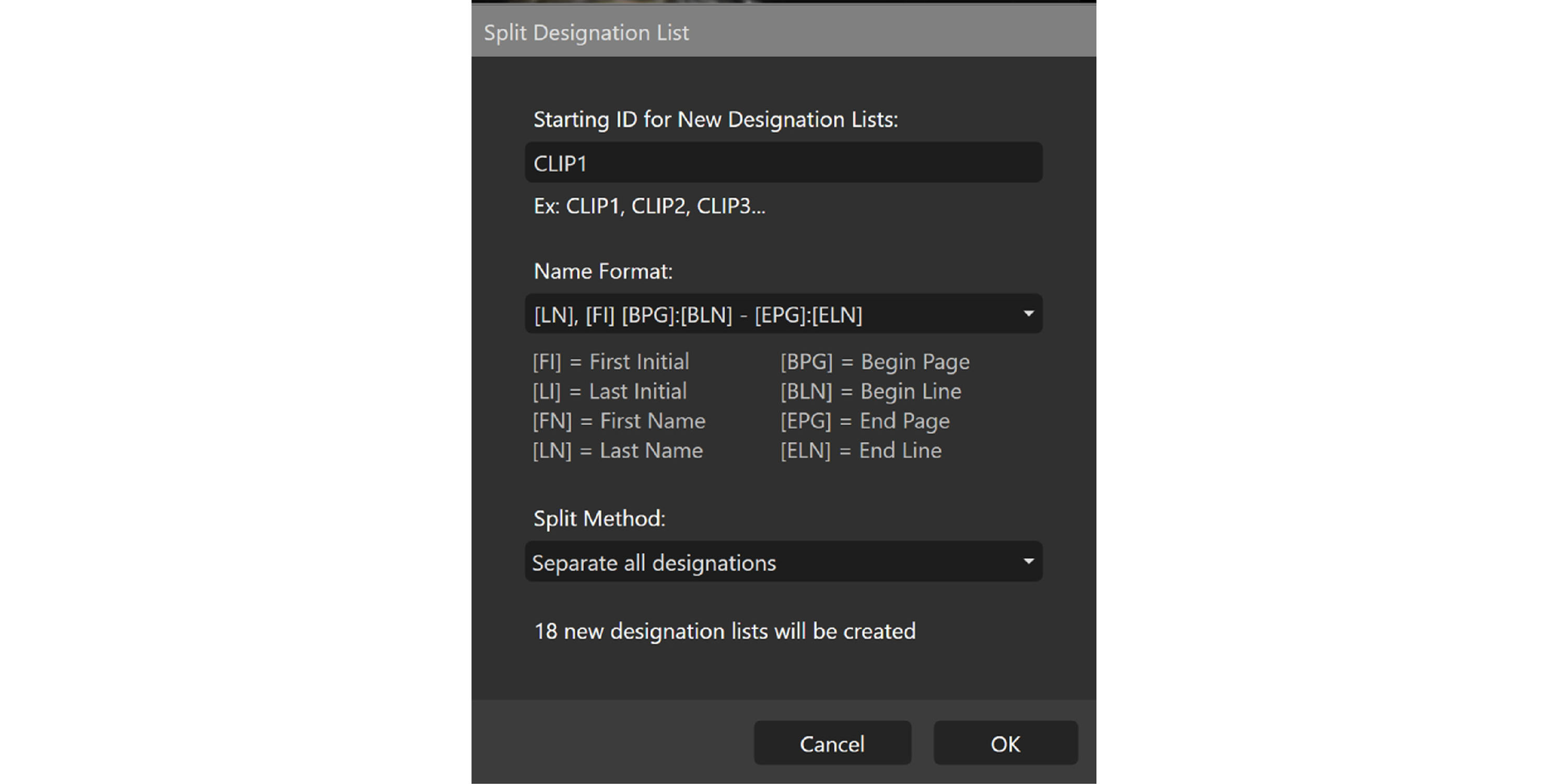 In addition to the preview of the ID, you can determine what the name will be for the newly created Designation Lists. The codes are fairly self-explanatory and the default will give you last name, first initial beginning page:beginning line – endpage:endline. The first designation on my list would will be named Jain, D 23:22-24:07, but you can create any combination of the options.