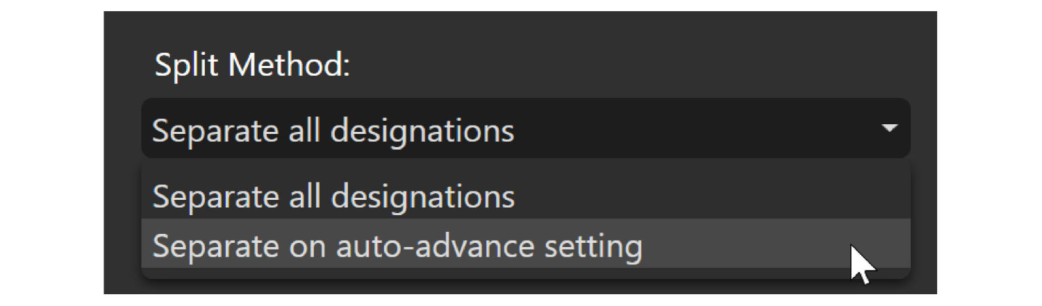 Under the Name Format you have the Split Method. This is where the auto-advance arrows come into play. If you want designations that play automatically into the next (down arrows) to group with the subsequent designation, choose "Separate on auto-advance setting."