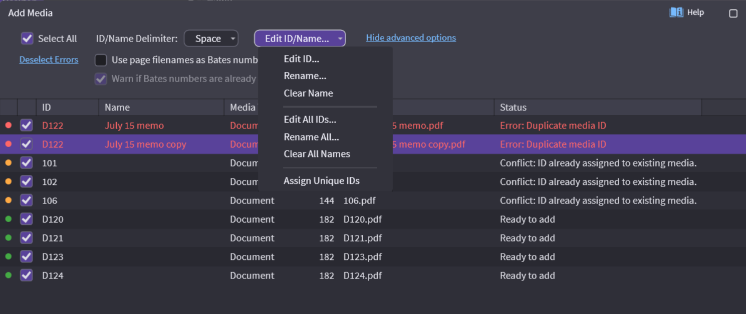 Sometimes you will have to work with documents that do not start with page 1. You can use the Right-Click menu option Renumber IDs to change your page IDs to match the document.