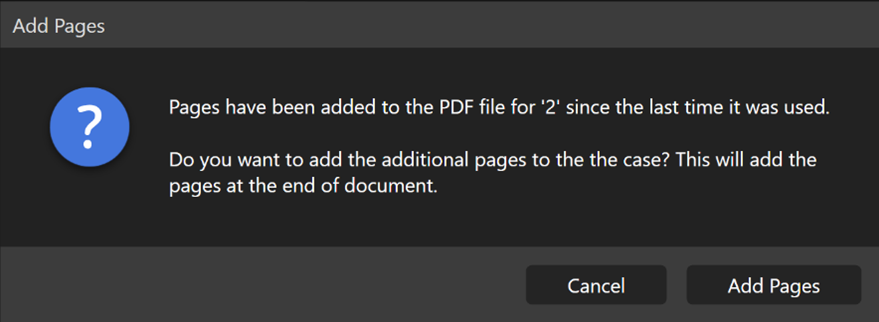 Add the pages and hit refresh. Done. If you are changing a document and adding pages in the middle, you will get the same dialog. OnCue will read the pages in order.