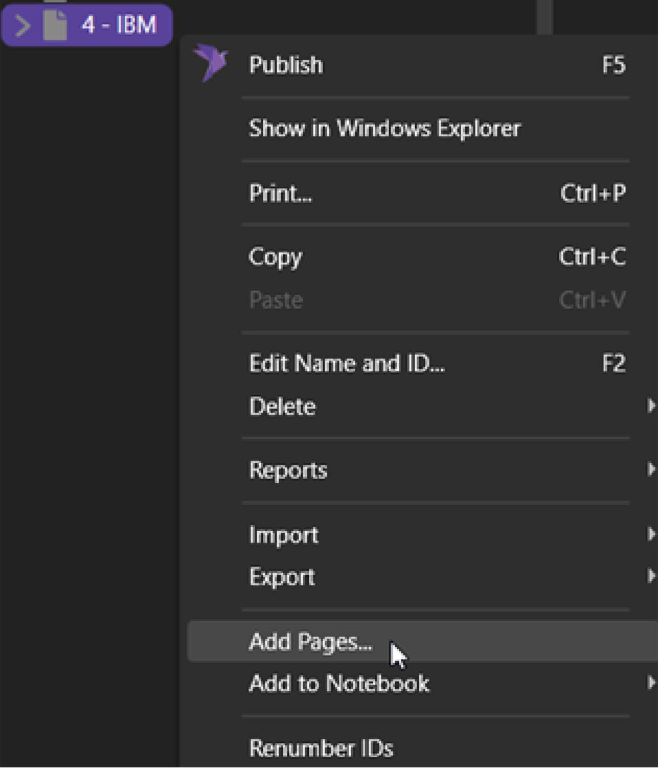Back in OnCue, right-click on the document you want to add the pages to (4-IBM) and select Add Pages.