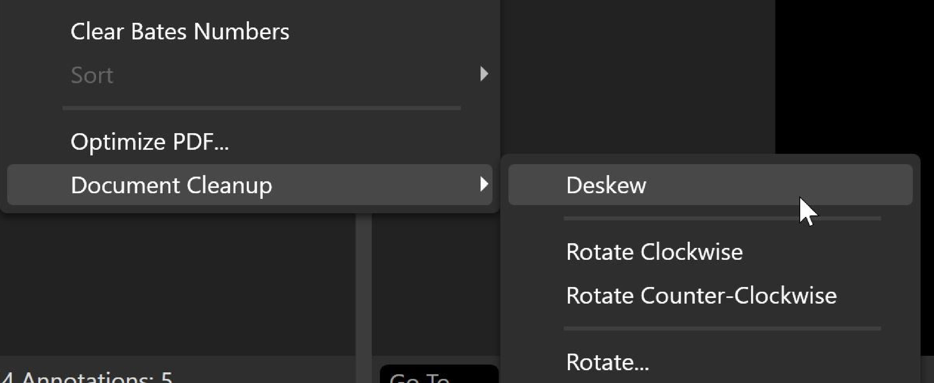 Document cleanup is for batch deskewing (nudging) and rotating document pages. It can be found on the right-click menu when selecting a document or group of documents.
