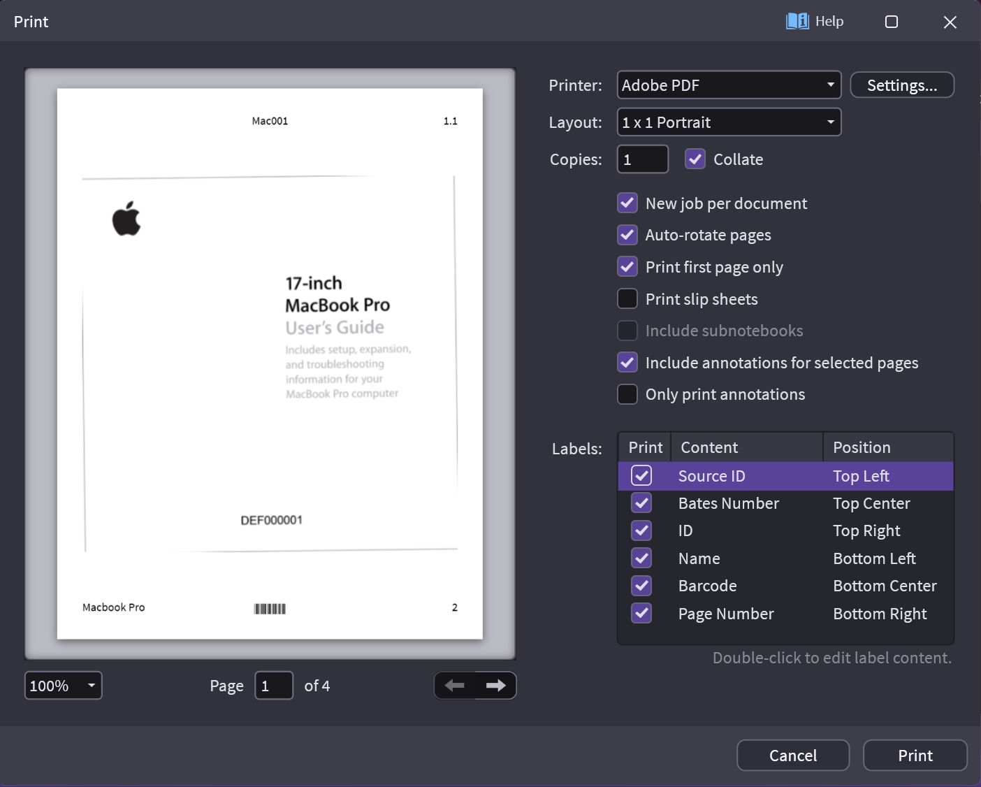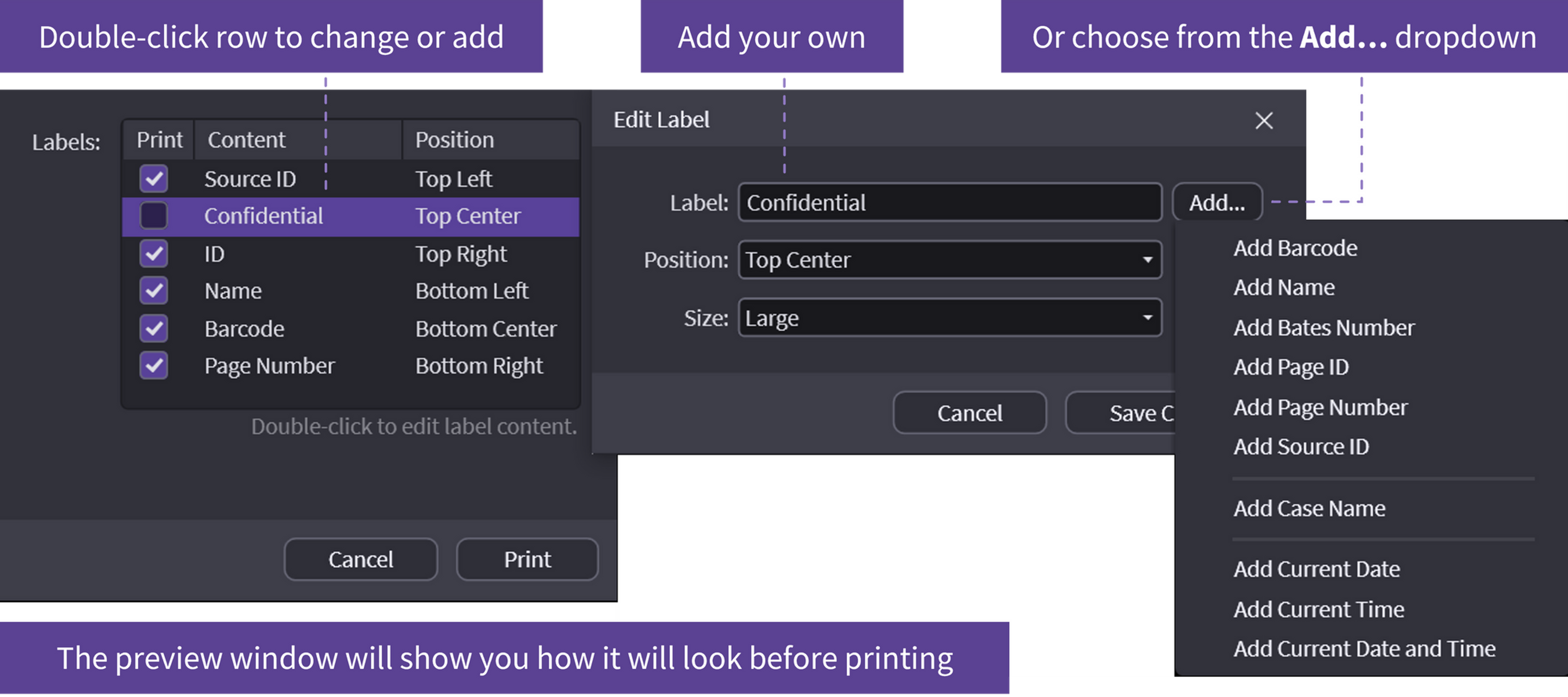 Double-click a row to change or add or choose from the Add... dropdown. The preview window will show you how it will look before printing.