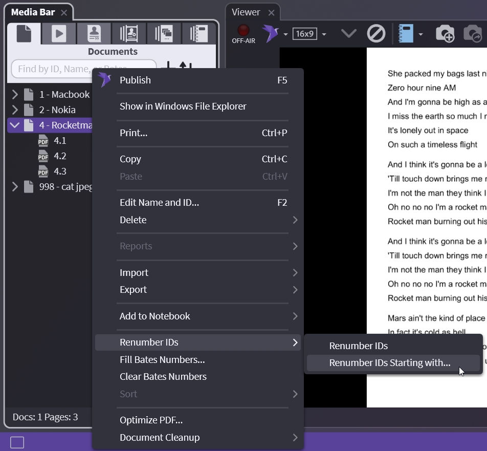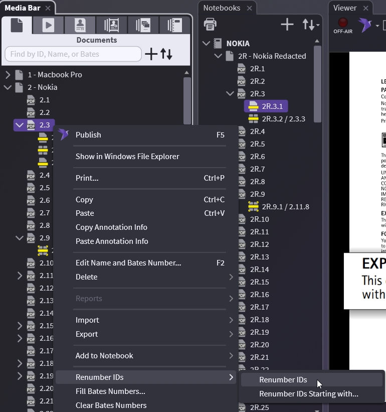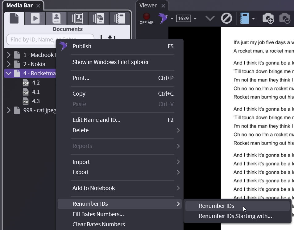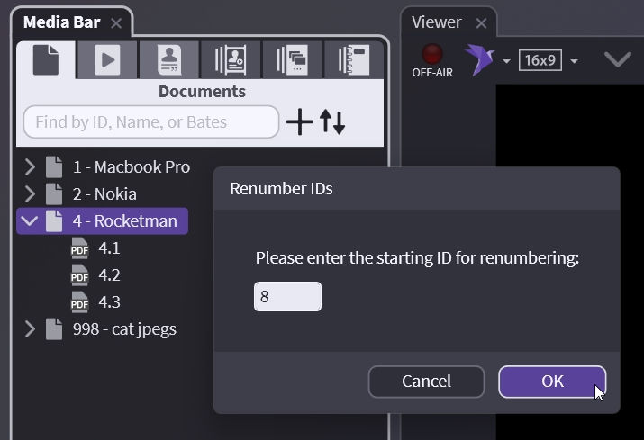Now right-click on your document, choose Renumber IDs, and choose Renumber IDs again. This renumbers your document starting at 1.