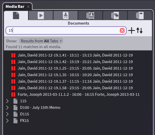 You can search the entire case by using the dropdown and selecting to show Results from All Tabs. This will show anything that can be called up in Presentation mode (excluding Notebooks) with your search criteria showing either their ID, name, or Bates.