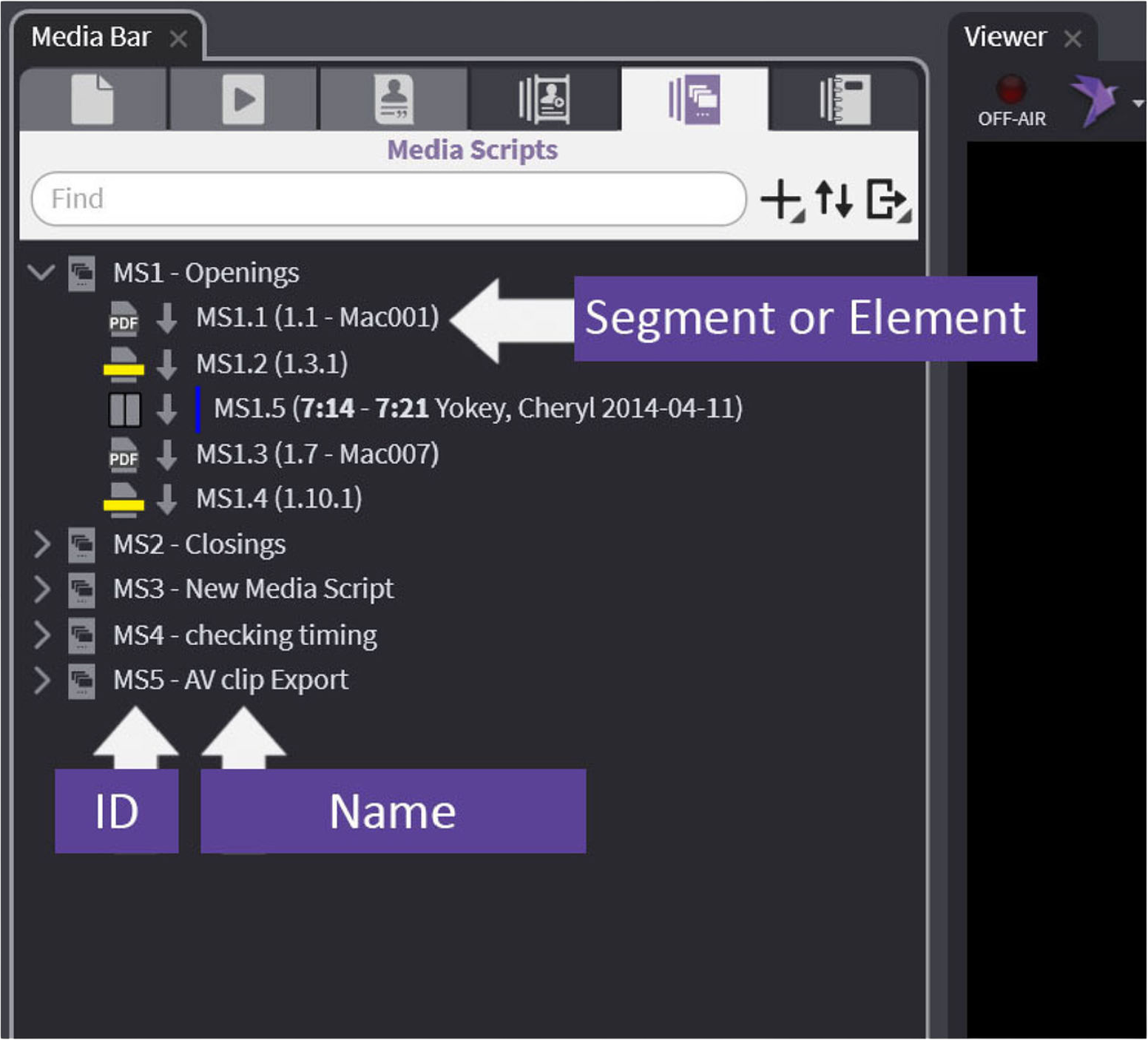 Media Scripts are a way to create a linear slideshow (like PowerPoint) for the specific purpose of bringing up items in sequence, such as an Opening Statement, expert witness exam, oral argument, or anything else you want to present in a certain order. You can add any media that is registered in OnCue to a Media Script (specific pages, treated pages, video and audio clips, even synced deposition designations). Below is a diagram of the elements of a Media Script.
