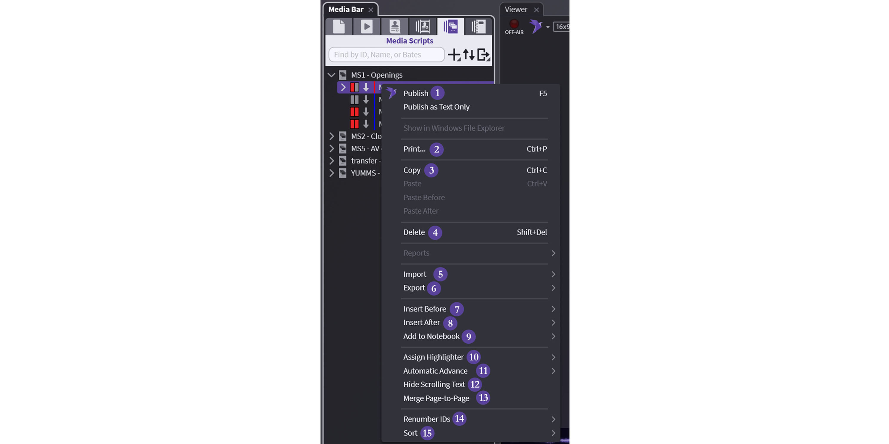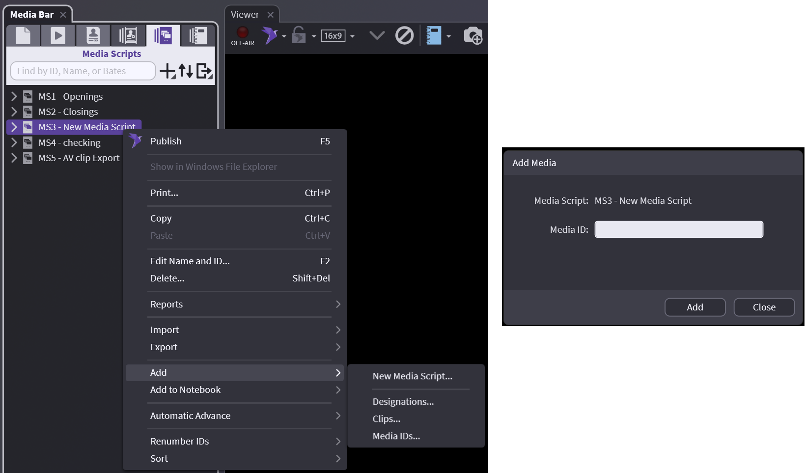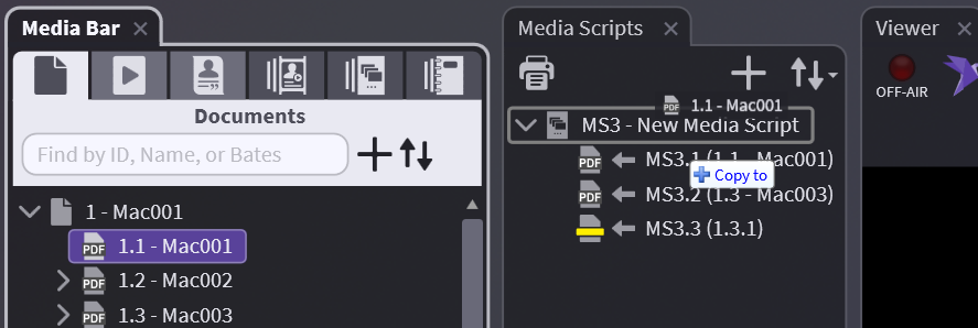 Within the Media Bar you can now select any page, designation, or clip and drag it to the Media Script in the Sidebar.