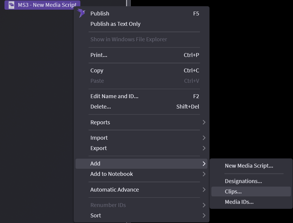 Right-click on your list and select Add -> Clips