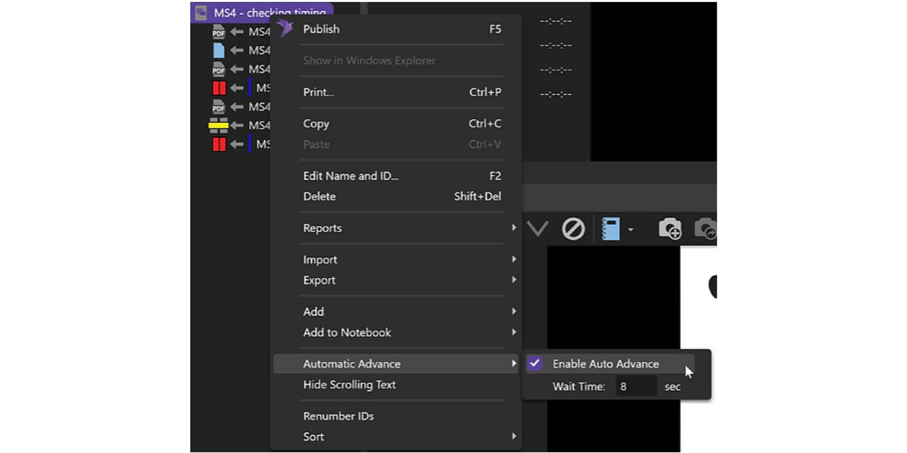 Right-click on your Media Script and select Automatic Advance. The default is 8 seconds.