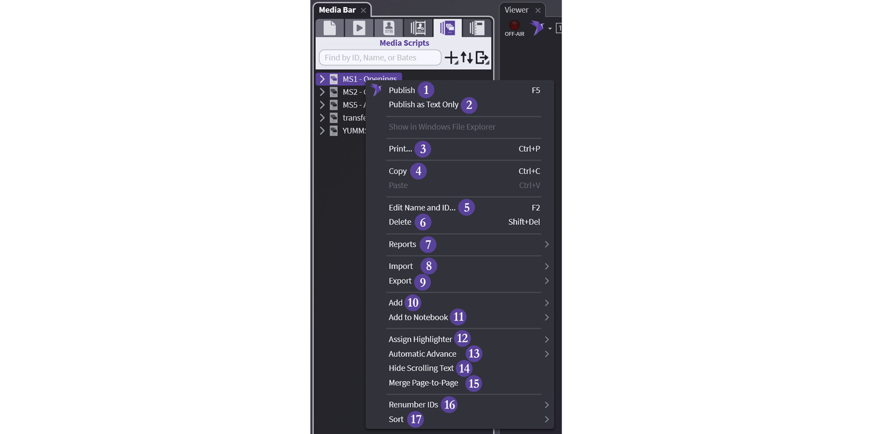 Media Scripts are a way to create a linear slideshow (like PowerPoint) for the specific purpose of bringing up items in sequence, such as an Opening Statement, expert witness exam, oral argument, or anything else you want to present in a certain order. You can add any media that is registered in OnCue to a Media Script (specific pages, treated pages, video and audio clips, even synced deposition designations.)