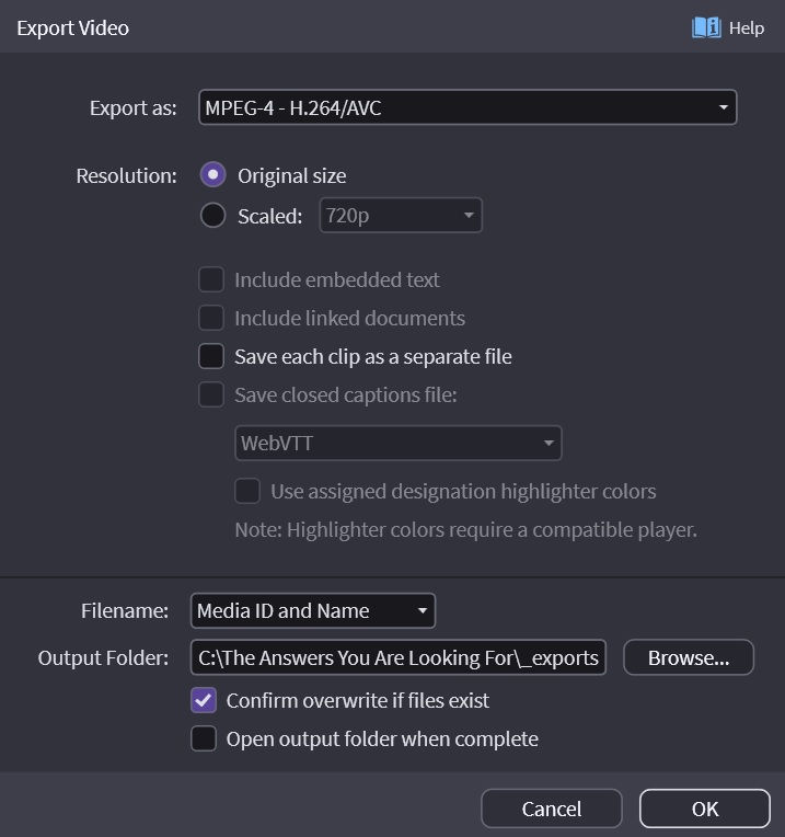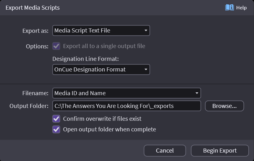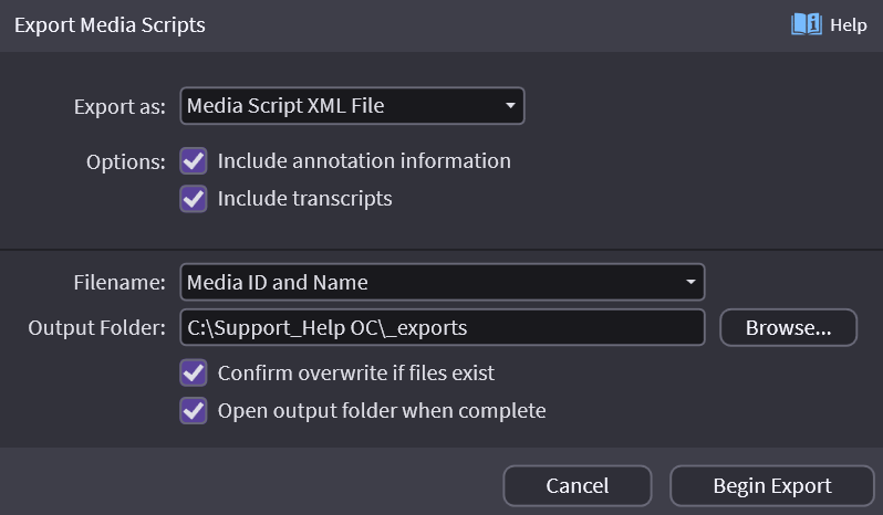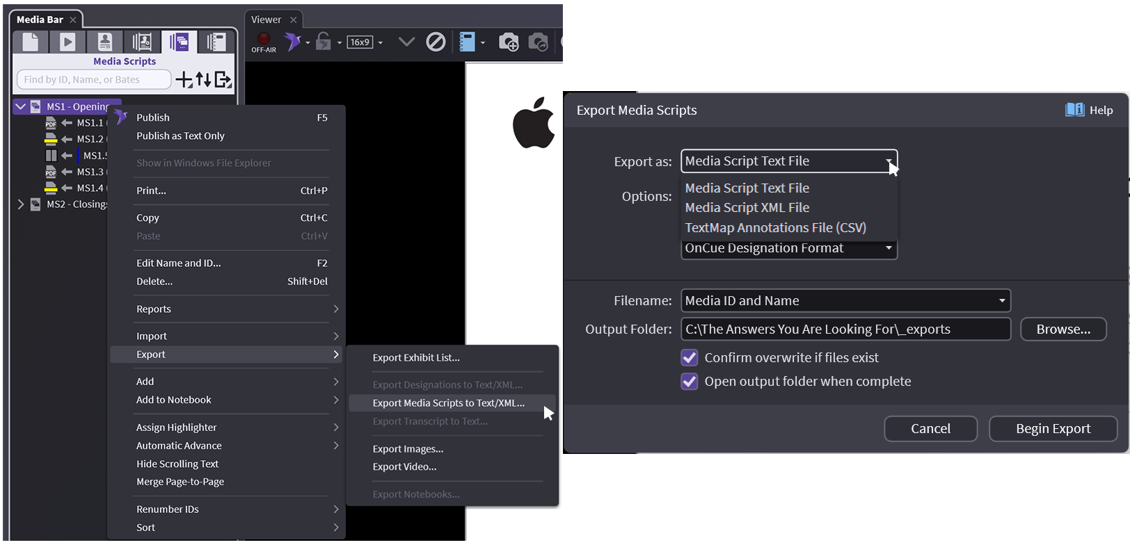 We created this export so you can share Media Scripts between different OnCue cases. This export includes the IDs, audiovisual clip information, a synched transcript (if selected), tuning information on all designations, document links, document clears, and document annotation information for those that are linked (optional).