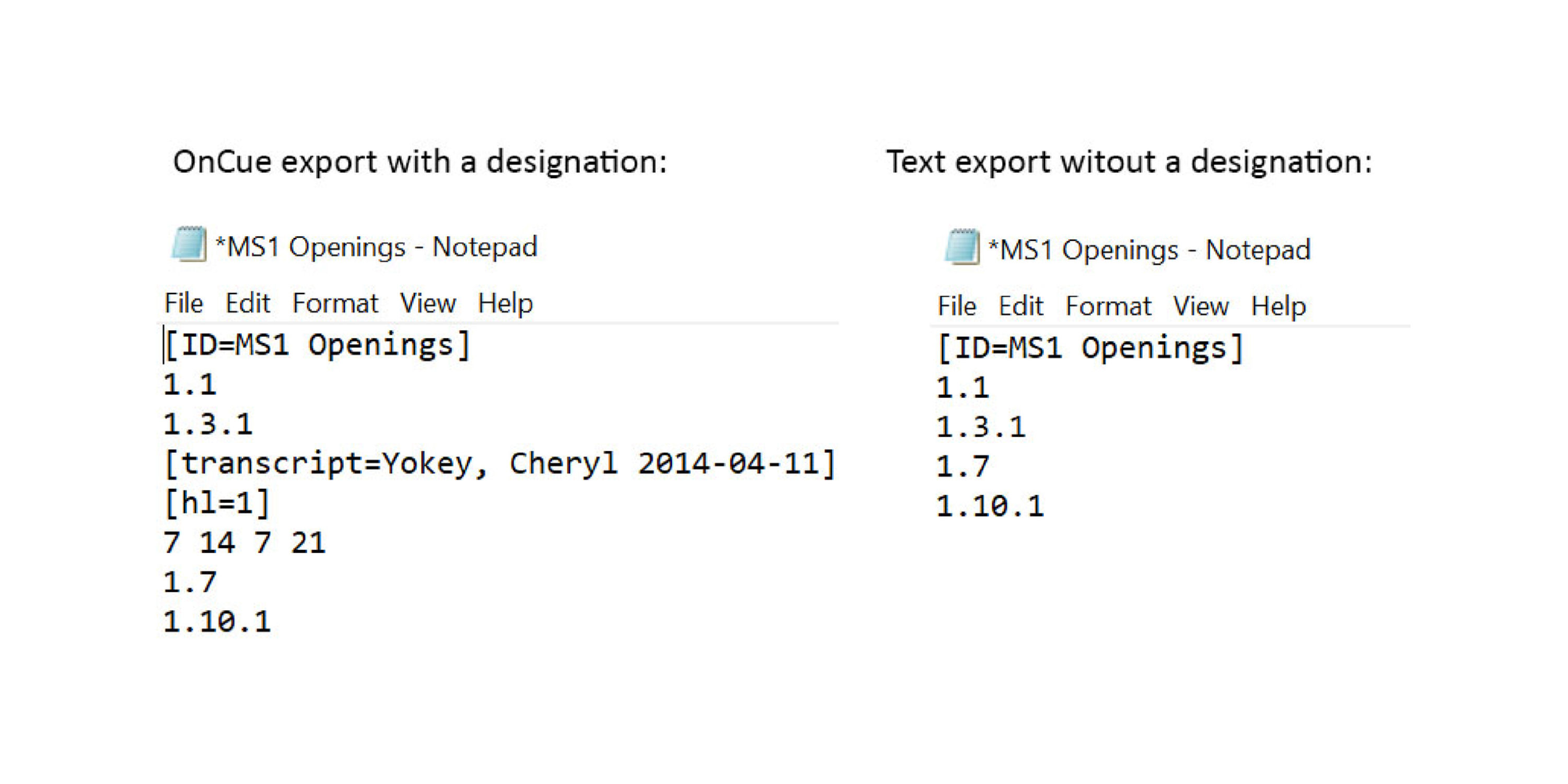 There are options available, depending on what your needs are. OnCue Designation format would be the same format as an import file, complete with headers. The text files contain Media IDs (document, page or annotation), designations and any clip information you put in your Media Script without any fine-tuning you have done to your designation.