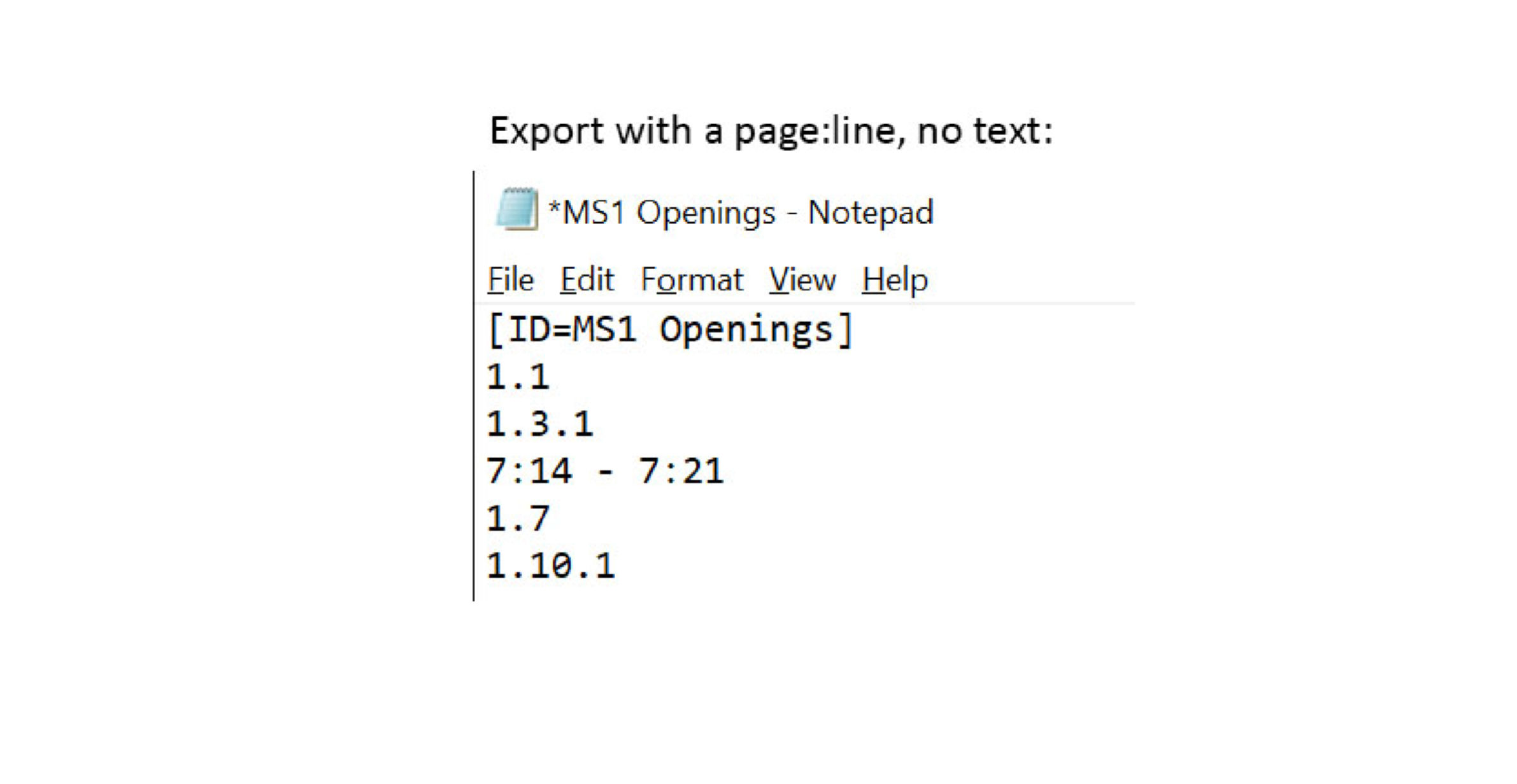 The other options are basic text files that use a "pg:ln to pg:ln" format, either with or without the transcript text. They are similar to what a report would be, but very stripped down and in a txt format.