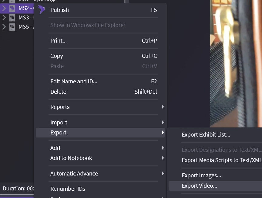 And finally, you can export your media scripts to video. This include documents, clips, designations. Be sure to have your auto advance set to an appropriate amount of time otherwise the docs will go by quick!