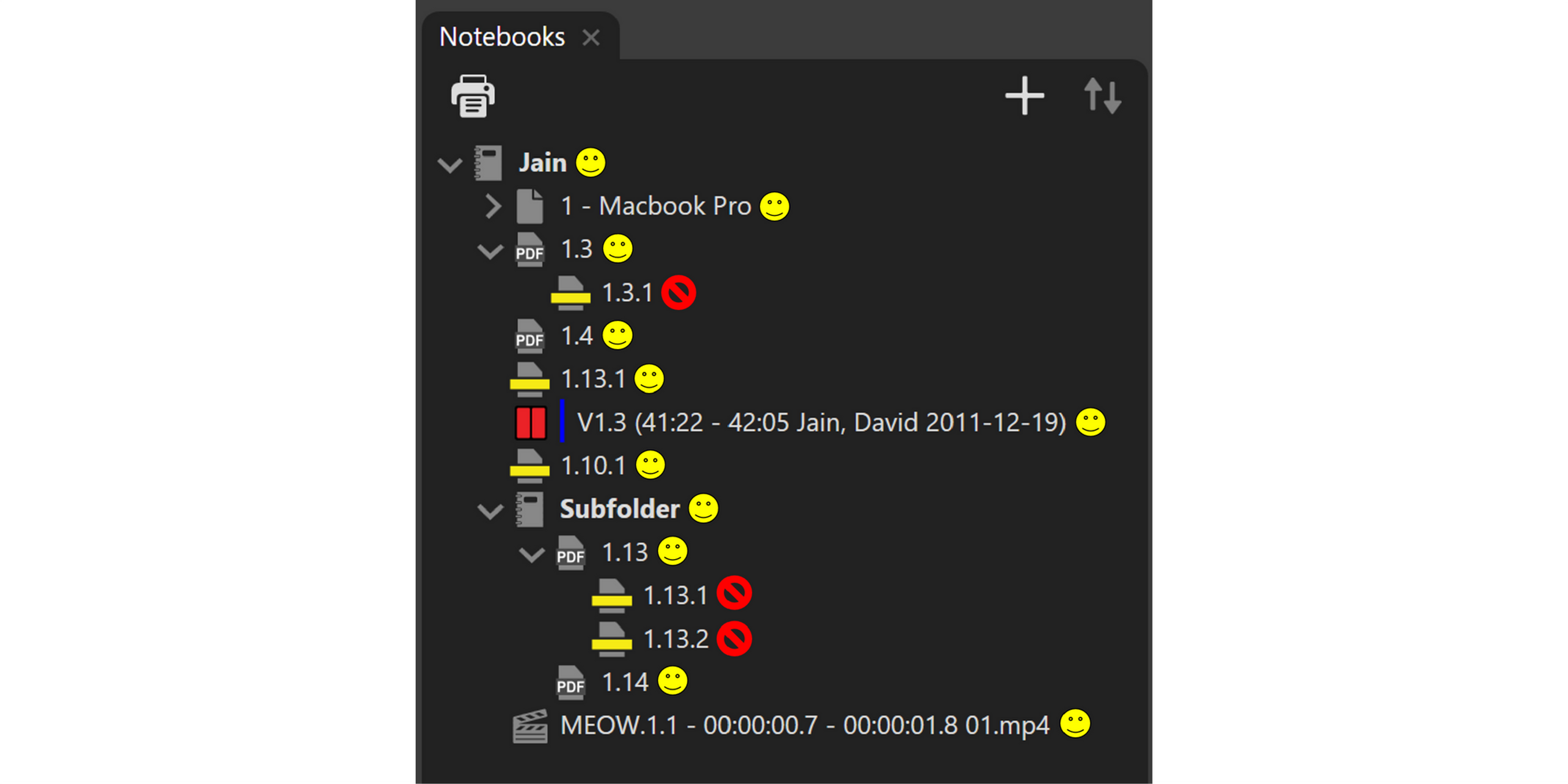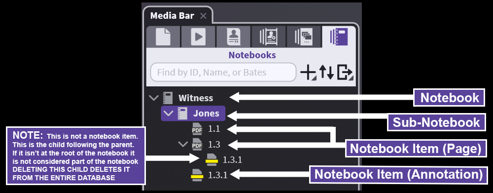 Notebooks allow you to organize any "Parent" media (document, designation list, media sequence) or part of that media, also called "Children" (pages, annotations, designations, sequence element) in any way you'd like. But this flexibility comes with a bit of a learning curve.