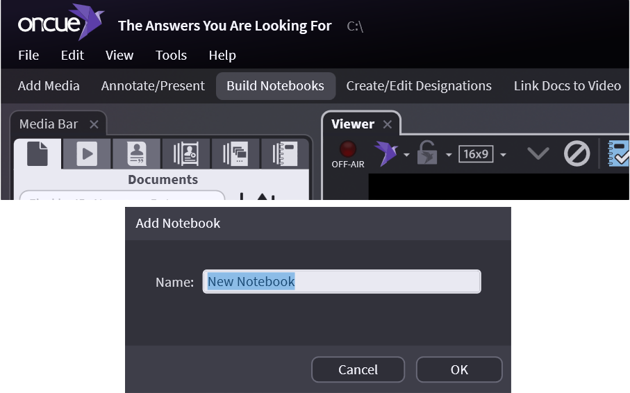 Notebooks are a great way of organizing the material in your OnCue database. You can use notebooks to group any media within the OnCue case into more manageable subset that can be printed and/or presented.