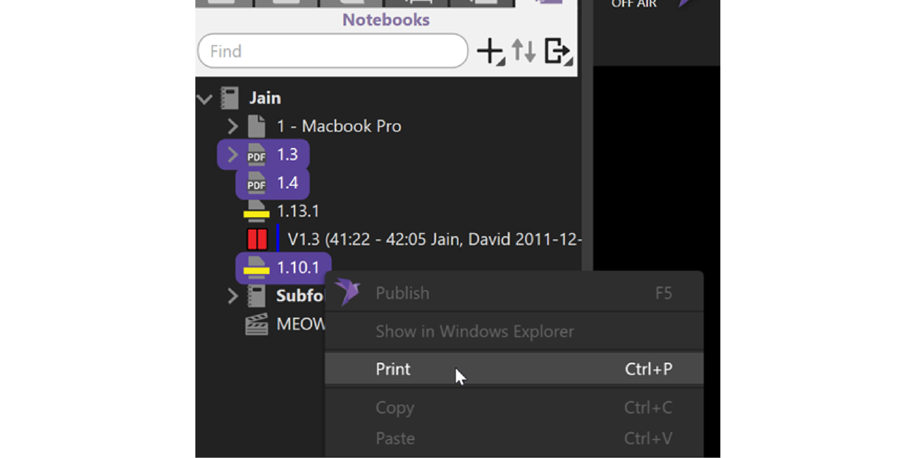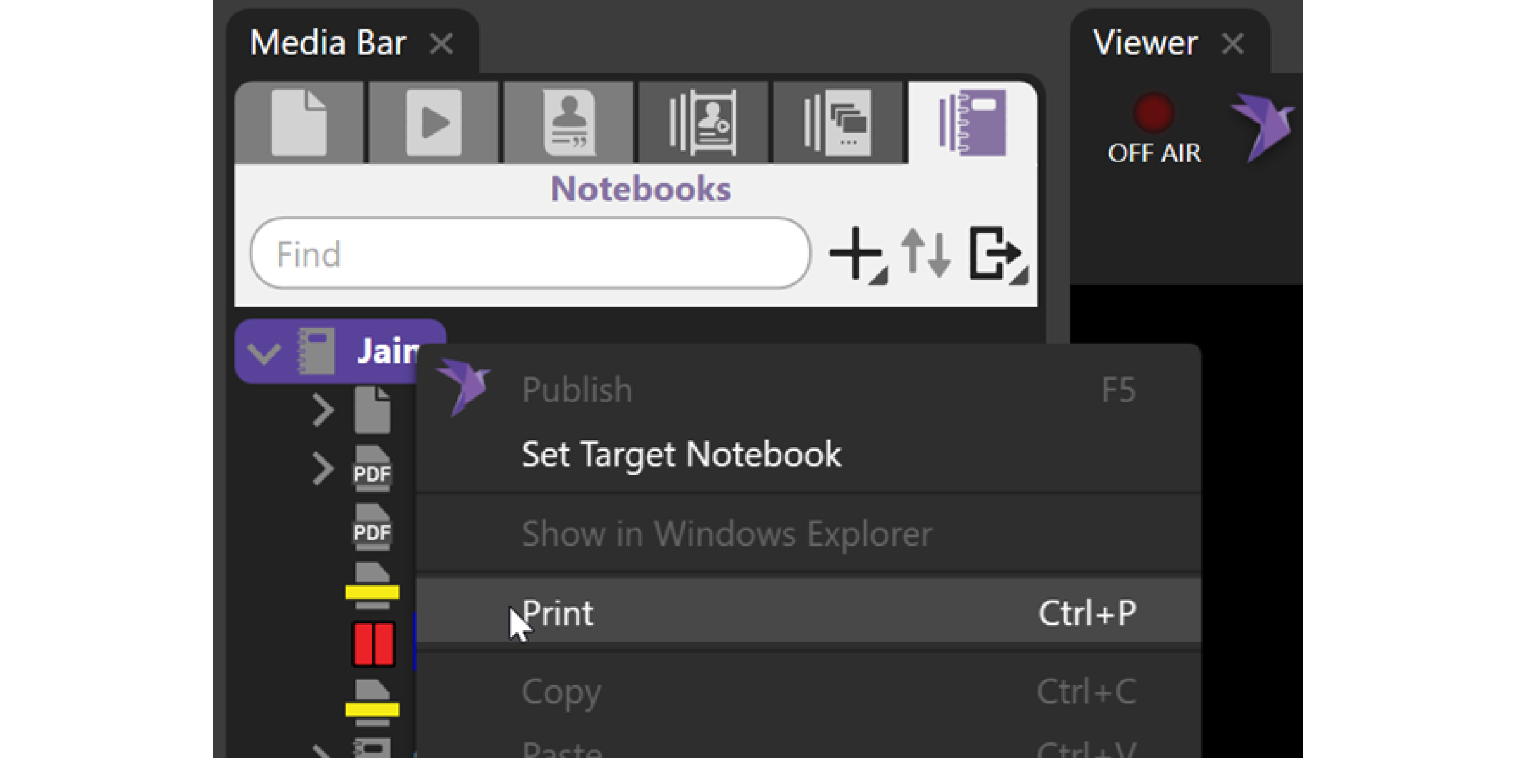 If you want to print only a few items and not the entire notebook, simply select each item you want to print while holding down the CTRL key. Once you have selected the items within the Notebook that you want to print, right-click, and select Print from the drop-down menu.