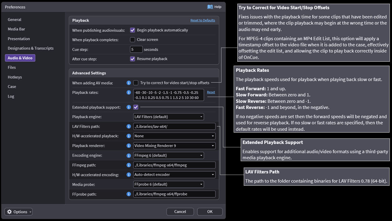 To access Preferences, go to Edit > Preferences in the top left corner of the program. Each section below shows a series of screenshots of OnCue's Preferences for your reference.