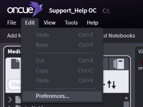 To access Preferences, go to Edit > Preferences in the top left corner of the program. Each section below shows a series of screenshots of OnCue's Preferences for your reference.