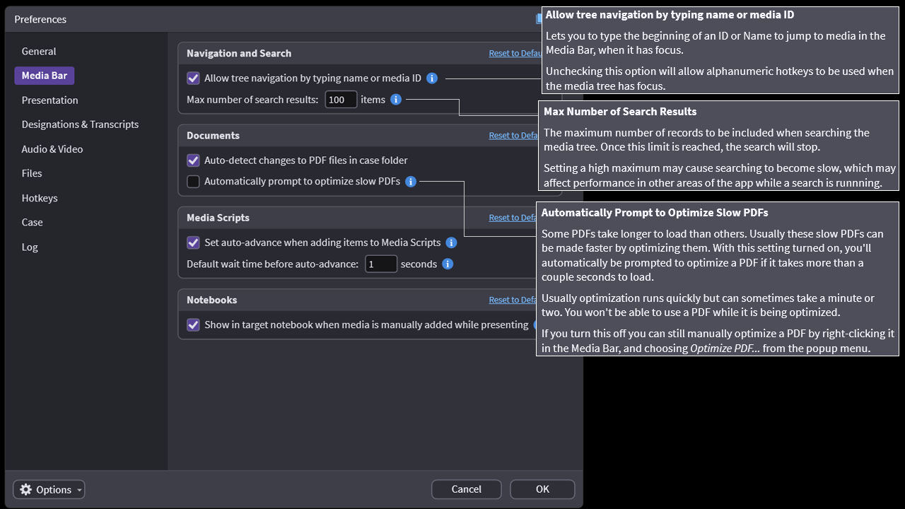 To access Preferences, go to Edit > Preferences in the top left corner of the program. Each section below shows a series of screenshots of OnCue's Preferences for your reference.