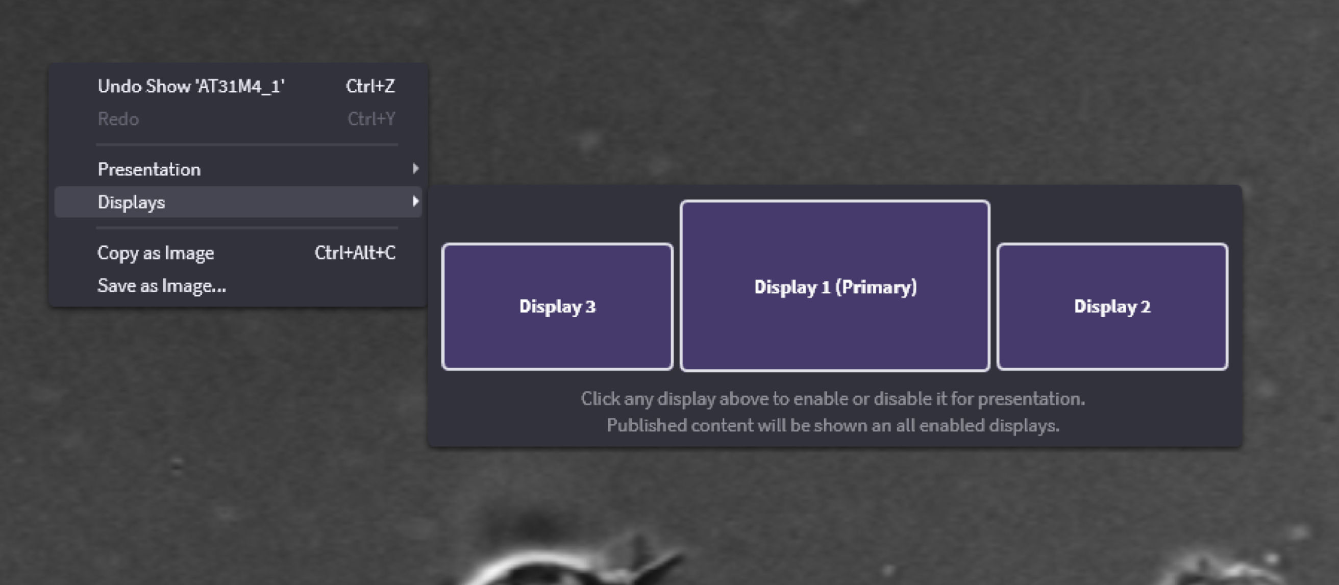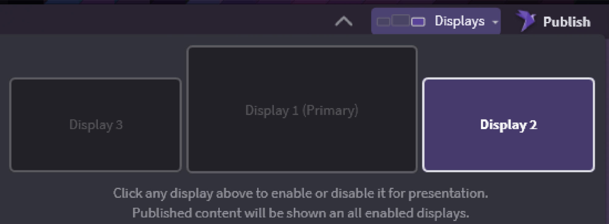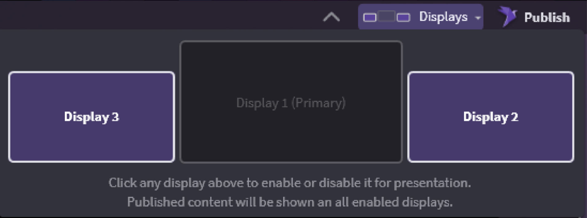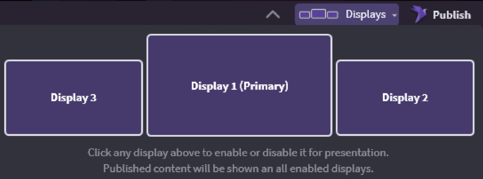 In OnCue, you can choose which monitor your Presentation shows up on. Just click on the displays, make sure they show purple and that is where the Presentation will go. You can even name them now but be careful, they cannot be reset only renamed.