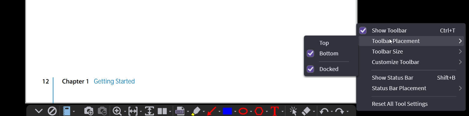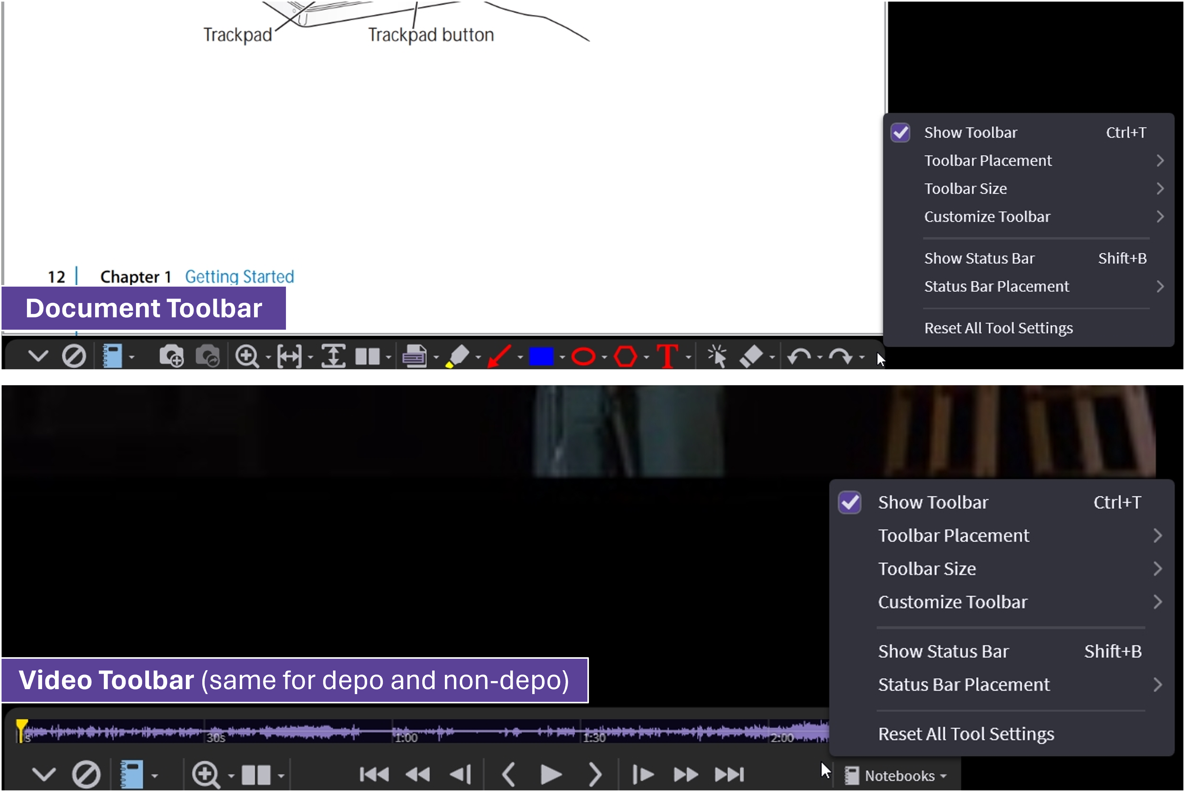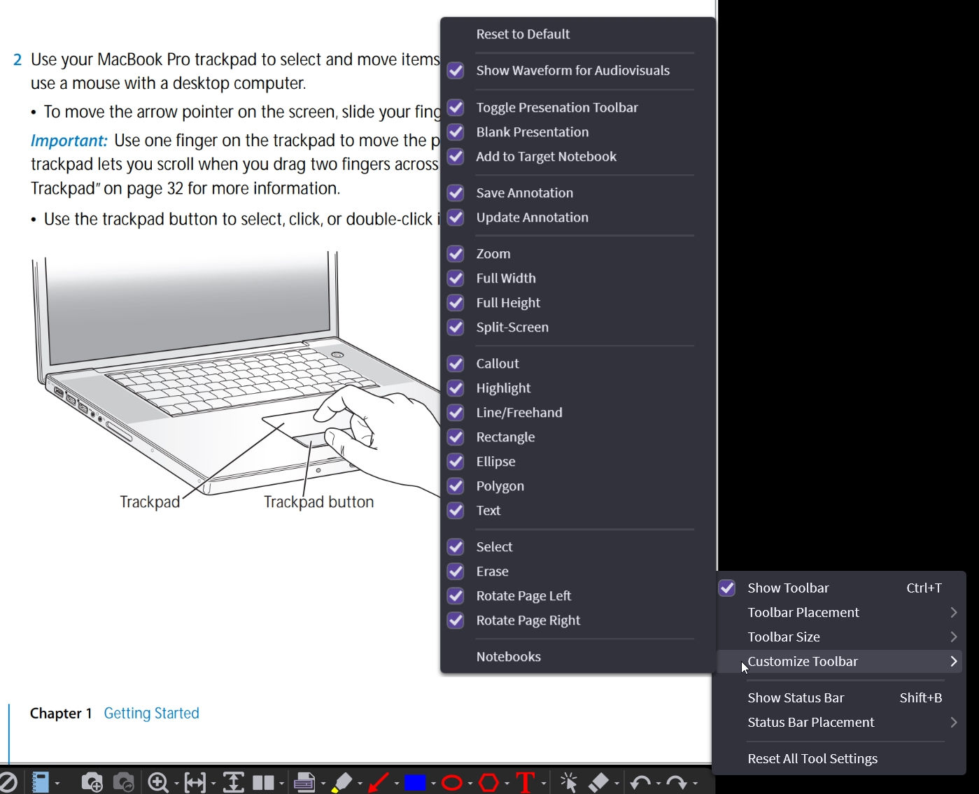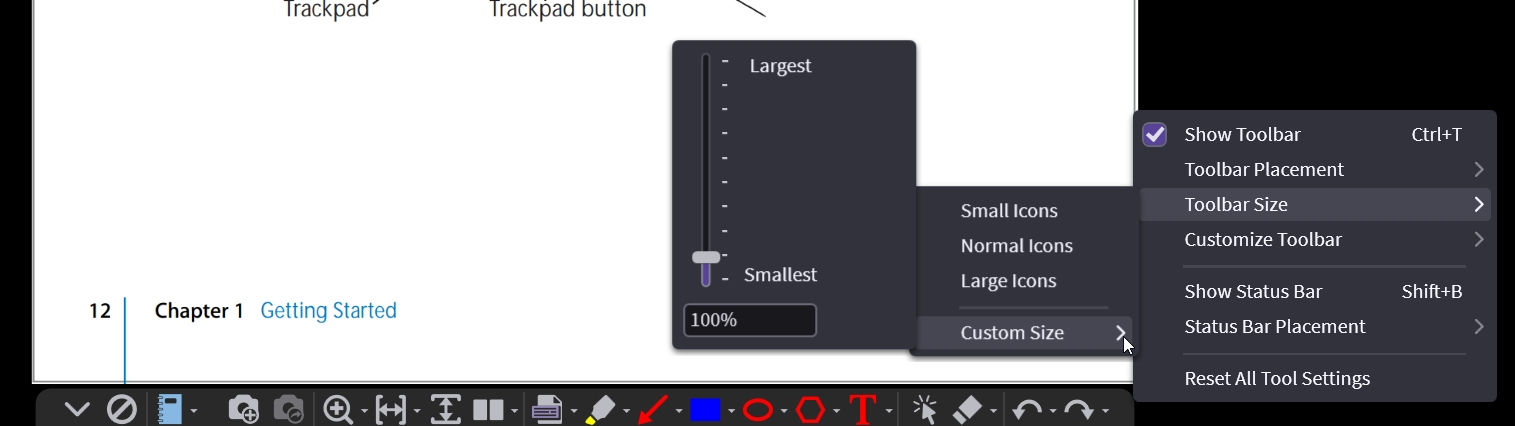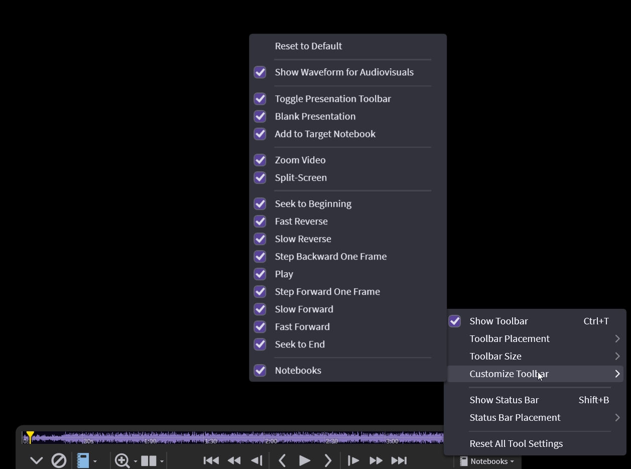 The Viewer Pane and Presentation Mode of OnCue have independently controlled toolbars. Each can be customized as to which buttons are visible and how big they are.