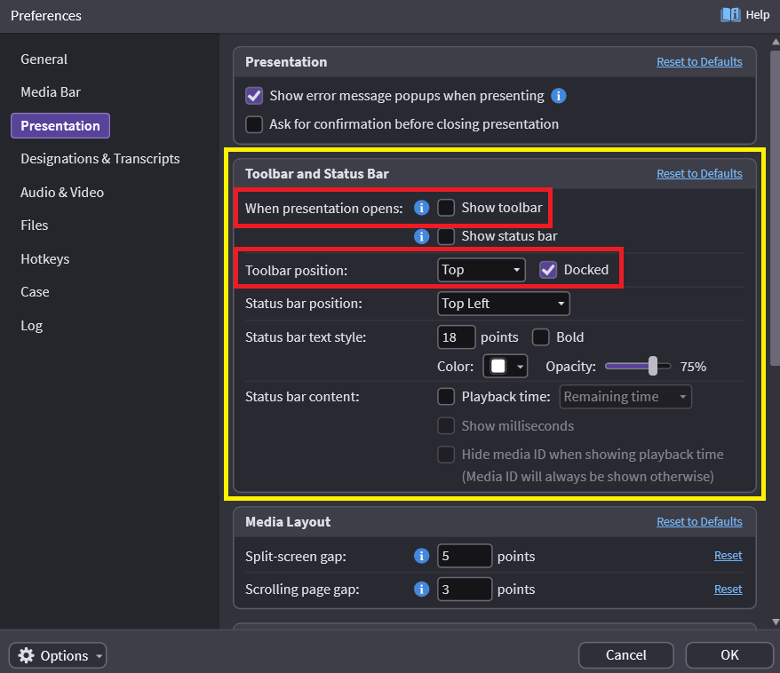 Select the Presentation section on the left-hand side. Notice the items you can set: