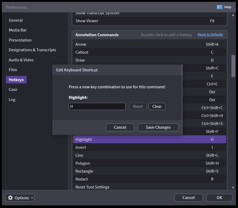 OnCue offers a fully customizable set of hotkeys that can be modified from the Preferences window. Simply double-click on the command you would like to change and assign it a new hotkey. Under Options in the lower left corner, click 'Reset to Defaults' to reset all hotkeys to their default values.
