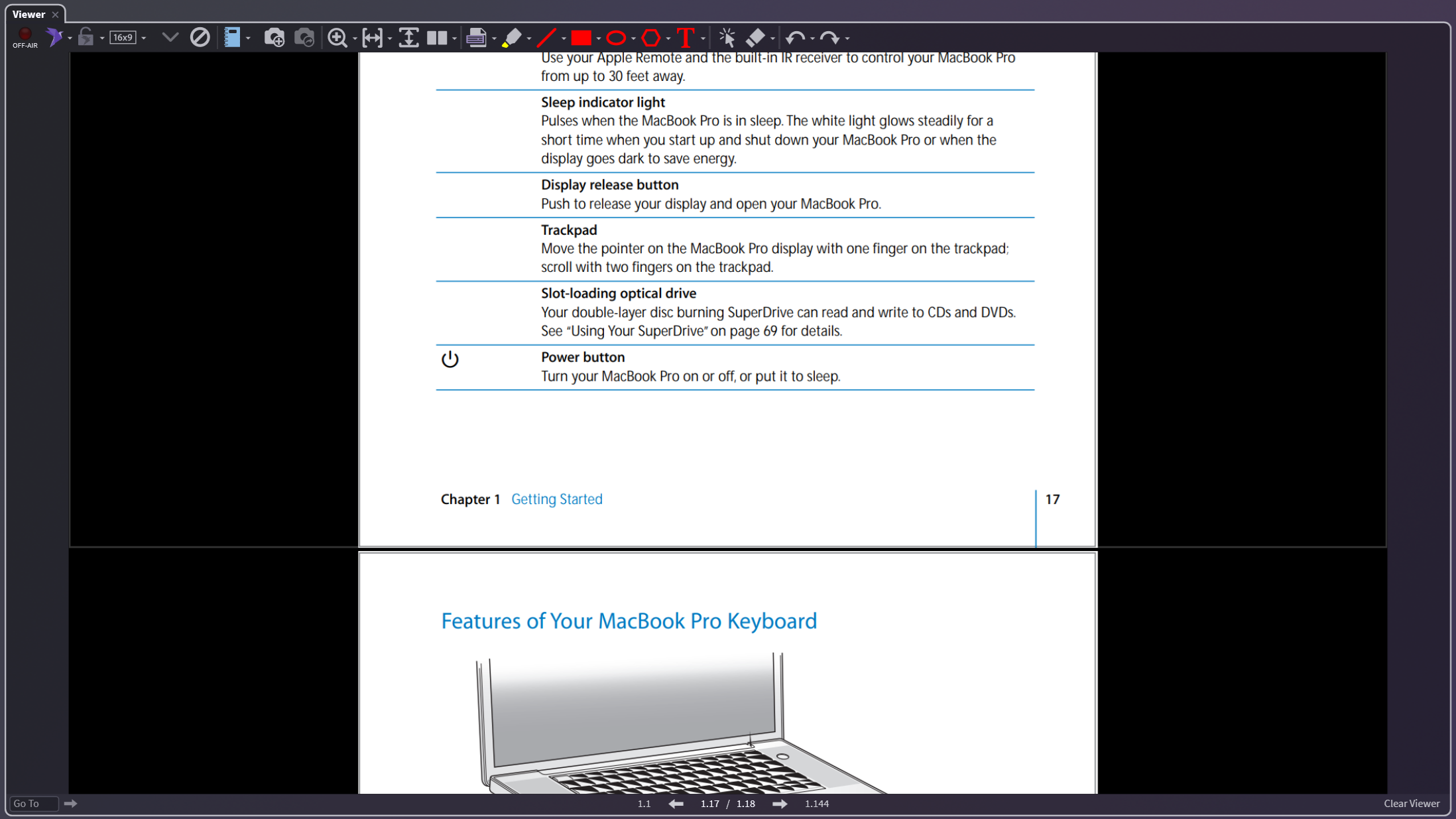 Start at your main page and position the mouse near the bottom of the Viewer, hold in the CTRL key, then right-click and drag the mouse up from the bottom of the screen to drag the next page up.