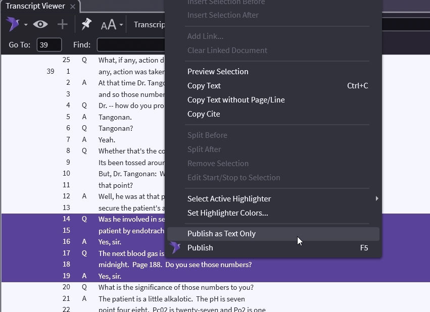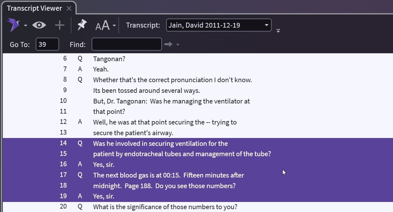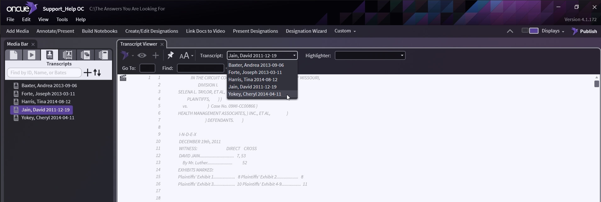OnCue can instantly present any selection of synchronized transcript testimony, either by video or by text only.