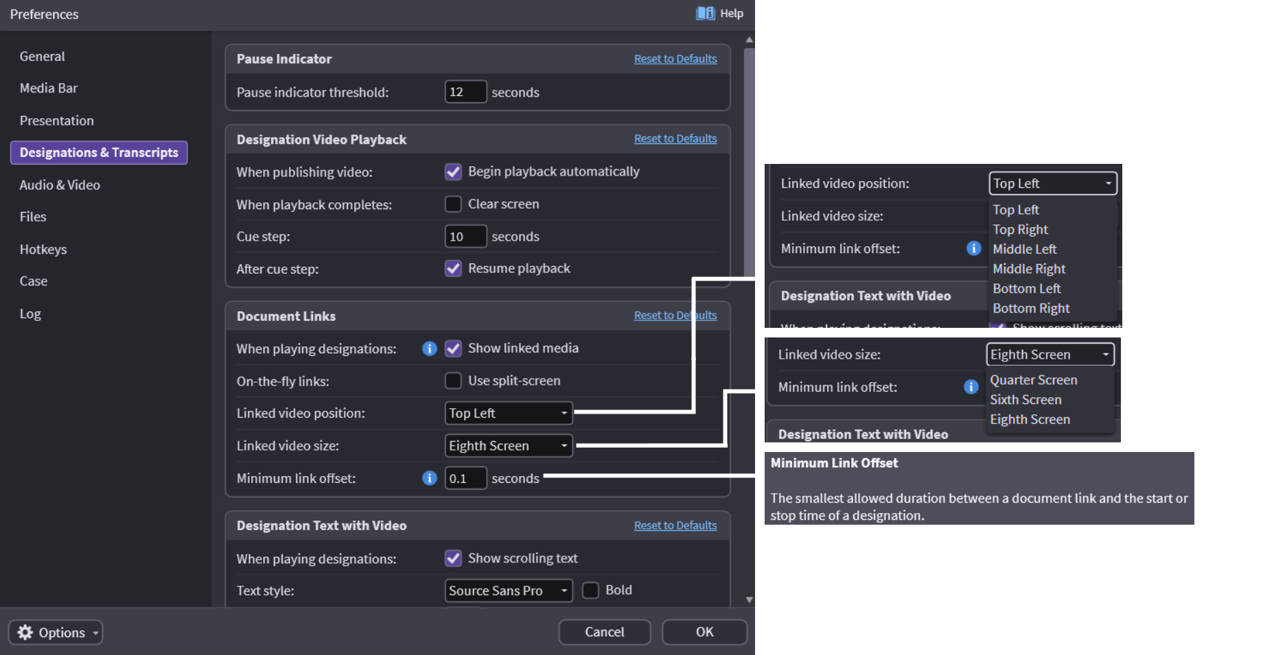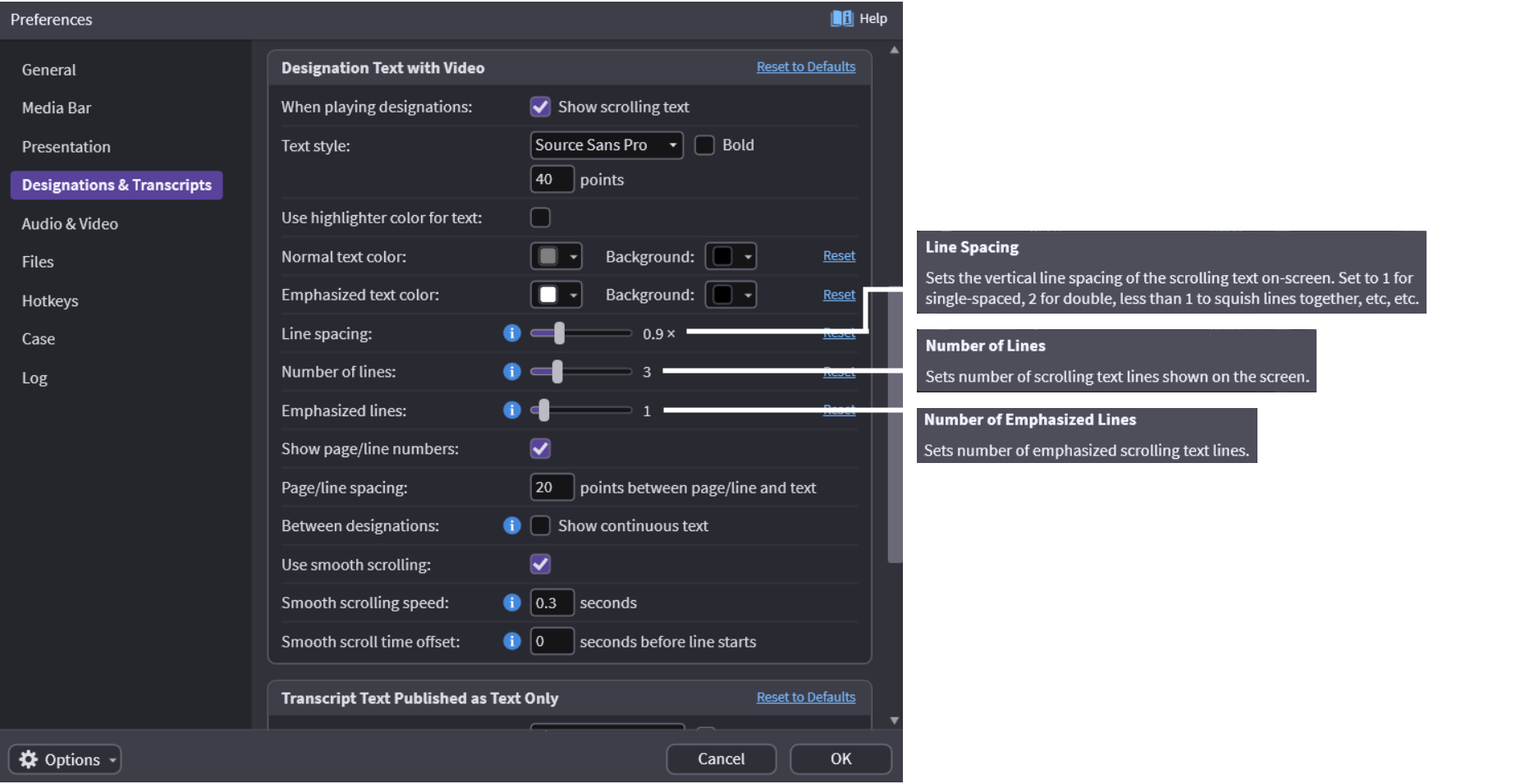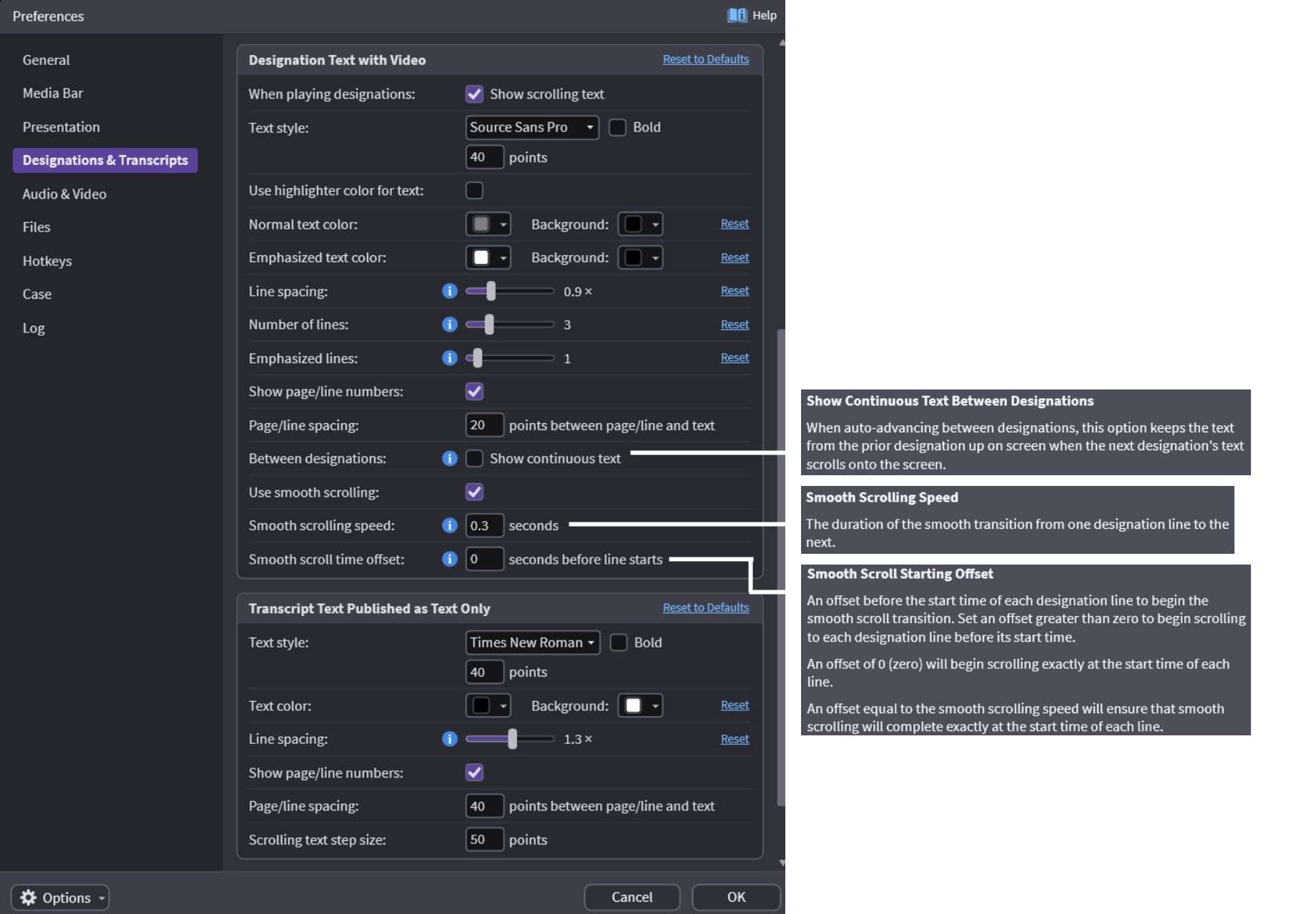 You can change how text is presented in both scrolling on the video and the text-only form by going to Edit > Preferences > Designations & Transcripts.