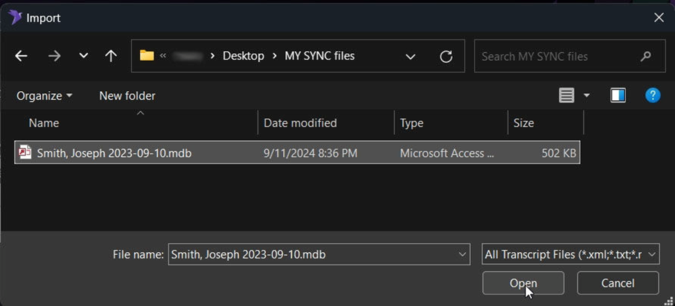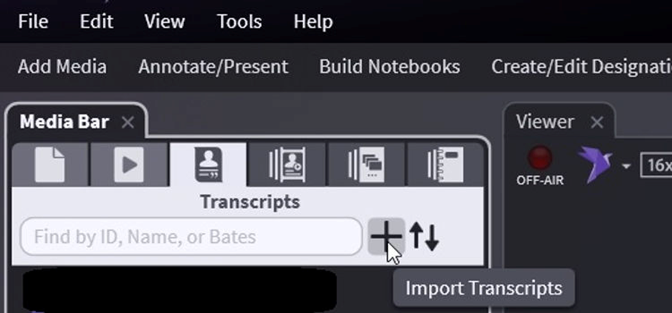 To import sync files, click on the + sign on the Transcripts tab of the Media Bar, which will allow you to browse/navigate to and select your sync file(s).